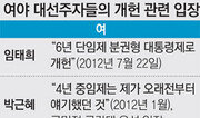 새누리당과 민주통합당의 일부 대선주자가 22일 권력구조 개편을 포함한 개헌을 공약으로 내걸며 이슈화를 시도했다. 새누리당 김태호 의원과 임태희 전 대통령실장은 이날 기자회견에서 각각 정·부통령제 4년 중임제와 6년 단임제로의 개헌 의사를 밝혔다. 4년 중임제를 주장하는 민주당 김두관 전 경남도지사와 정세균 의원도 이날 각각 “집권 시 1년 안에 국민투표에 부치겠다” “당장 개헌 특위를 구성해 논의를 시작하자”며 개헌에 강력한 의지를 보였다. 여야 일부 후발 주자가 이처럼 개헌 이슈를 점화하는 건 대선 경선 초반 ‘초대형 이슈’를 통해 판 흔들기를 하려는 시도로 풀이된다. 새누리당 이재오 의원도 19일 자신이 마련한 분권형 개헌안을 여야 국회의원 299명에게 전달했고 범국민운동도 구상하는 등 개헌 이슈 점화에 부채질을 하고 있다.반면 새누리당 경선후보인 김문수 경기도지사는 4년 중임제를 포함해 개헌에 부정적이고, 민주당 경선후보인 손학규 상임고문도 “지금은 논의할 때가 아니다”라는 태도다. 이처럼 같은 당내에서도 대선주자들 간에 개헌 여부, 개헌 시 권력구조 개편 방향에 대한 생각이 제각각이다.여야 선두권 주자들은 개헌에 대해 명확한 입장을 밝히지 않으며 소극적으로 대응하고 있다. 새누리당 박근혜 의원은 2004년 당 대표 시절부터 4년 중임제를 선호해왔지만 국민적 공감대라는 전제를 늘 달아 왔다. 박 의원이 최근 뚜렷하게 의사를 밝힌 적은 없지만 이번 대선에서 개헌을 공약으로 내걸 가능성은 크지 않다는 게 캠프 내 대체적인 전망이다. 홍사덕 캠프 공동선대위원장은 이날 “가을 추수를 해야 할 때에 모내기를 하자고 할 수 있나”라며 “집권 후 개헌을 논의하겠다는 정도는 있을 수 있지만 이번 대선에 개헌을 언급하면 모든 대선 이슈가 블랙홀처럼 빨려 들어간다”고 부정적인 뜻을 밝혔다. 캠프 관계자도 “국민의 삶을 강조한 박 의원이 권력구조 개편을 이슈로 들고나올 가능성은 크지 않다”고 말했다. 안철수 서울대 융합과학기술대학원장은 최근 발간한 저서 ‘안철수의 생각’에서 개헌에 대한 질문에 “민주주의 역사가 오래된 나라일수록 한 사람에게 권한이 집중되는 게 아니라 견제장치가 잘 작동하게 돼 있다. 권력의 집중화를 견제하는 기관들을 지금부터라도 잘 만들어나갈 필요가 있다”며 분권의 필요성을 언급했다. 다만 “지금도 총리제의 입법 취지를 잘 살리면 어느 정도의 분권이 가능하다”며 개헌에 대한 구체적인 생각을 밝히지 않았다.민주당 문재인 의원은 22일 기자들의 질문에 “정권 교체 시기에 개헌을 논의하는 것은 여러모로 바람직하지 못하다”며 당장 개헌 이슈를 불붙이는 데는 소극적인 태도를 보였다. 다만 “집권 이후 개헌을 논의하는 기구를 만들겠다”는 것을 전제로 “대통령제를 유지한다면 4년 중임제, 대통령제보다는 내각제가 훨씬 좋은 제도”라는 뜻을 밝혔다. 문 의원이 내각제 선호 의견을 밝힌 것을 놓고 안 원장과의 공동정부를 염두에 둔 것 아니냐는 해석도 나왔다.중앙대 장훈 교수는 “지금은 개헌 논의에 동력이 붙을 만큼 경제·사회·정치적 위기가 아니라는 점, 국민과 대선주자 사이에 최소한의 합의를 이루기도 어렵다는 점 때문에 개헌이 대선의 폭발적인 이슈가 되기 힘들다”면서 “마이너 주자들은 변화를 주도한다는 인상을 보여주거나 지지세력 확장을 위해 개헌 카드를 꺼내들겠지만 선두 주자들이 이에 동의하지는 않을 것”이라고 분석했다.동정민 기자 ditto@donga.com 장원재 기자 peacechaos@donga.com }