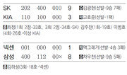 어제까지 전우였던 두 선수가 오늘은 적으로 만났다. 이날이 아니면 같은 곳에서 복무하다 제대한 두 선수는 올 시즌 만날 수 없는 운명이었다. 원 소속팀 롯데와 KIA가 4일 광주에서 올해 마지막 맞대결(16차전)을 벌였기 때문이다. 먼저 웃은 건 전준우(30·롯데)였다. 경찰청에서 제대한 전준우는 2회초 복귀 첫 타석에서 역전 3점 홈런을 때려냈다. 6번 타자 겸 중견수로 선발 출장한 전준우는 팀이 0-2로 뒤진 2회초 무사 1, 2루에 타석에 들어서 KIA 선발 김윤동(23)이 던진 바깥쪽 초구(시속 144km)를 받아쳐 오른쪽 담장 바깥으로 110m를 날려보냈다. 전준우가 1군 무대서 694일 만에 때려낸 홈런이었다. 웃은 채 경기장을 떠난 건 안치홍(26·KIA)이었다. 역시 경찰청을 제대하고 이날 복귀전을 치른 안치홍은 2타수 무안타(2볼넷)로 안타를 때리지는 못했지만 팀은 롯데를 4-3으로 꺾었다. 6회 등판한 KIA 투수 김진우(33)는 2이닝을 무실점으로 막고 지난해 6월 13일 이후 449일 만에 승리투수가 됐다. 잠실에서는 선두 두산이 홈런포를 앞세워 삼성에 7-5 재역전승을 거뒀다. 두산 양의지(29)는 3-4로 뒤진 5회말 역전 2점 홈런을 때려냈고, 5-5 동점으로 맞이한 7회말에는 오재일(30)과 박건우(24)가 각각 솔로포를 때려내면서 다시 앞섰다. 지난해 18승을 기록했던 두산 선발 유희관(30)은 이날 올 시즌 열다섯 번째 승리를 수확하면서 구단 역사상 처음으로 2년 연속 15승 이상을 기록한 투수가 됐다. 경찰청에서 이날 돌아온 두산 홍상삼(26)은 1156일 만에 세이브를 기록했다. 고척에서는 넥센이 4-3으로 쫓긴 6회말 2사 만루에서 윤석민(31)이 자신의 생일을 자축하는 싹쓸이 2루타를 때려내며 7-3으로 달아났고 결국 7-5로 넥센이 한화에 승리를 거뒀다. 수원에서는 kt 박경수(32)가 친정 팀을 상대로 생애 첫 끝내기 홈런을 때려내면서 팀에 4-3 승리를 선물했다. 마산에서는 SK가 NC를 9-4로 꺾었다. 한편 이날 프로야구는 지난해에 이어 2년 연속으로 700만 관중 돌파에 성공했다. 2012년까지 포함하면 역대 세 번째다. 황규인 기자 kini@donga.com}