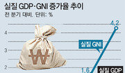 올 1분기(1~3월)에 유가 하락 덕분에 국민들의 실제 호주머니 사정을 반영하는 실질 국민총소득(GNI)이 5년 9개월 만에 가장 큰 폭으로 증가했다. 한국은행이 4일 발표한 국민소득 지표에 따르면 1분기 실질 국민총소득(GNI)은 전 분기 대비 4.2% 증가했다. 실질 GNI는 2009년 2분기(4~6월)에 5.0% 증가했지만 그 후로는 전 분기 대비 1% 안팎의 낮은 증가율을 보여 왔다. GNI는 한 나라의 국민이 일정 기간 벌어들인 임금, 이자, 배당 등의 소득을 모두 합친 것으로 국내총생산(GDP)에 수출입 가격의 변화에 따른 실질 무역 손익 등을 더해 계산한다. 한은 관계자는 “올 1분기의 경우 유가하락으로 수입품의 가격이 크게 떨어지면서 국민들의 실제 구매력이 늘어난 게 GNI의 증가로 이어졌다”고 설명했다. 또 내국인이 외국에서 벌어들인 소득이 외국인이 한국에서 벌어간 소득보다 더 많았던 점도 GNI를 높이는 요인으로 작용했다. 다만 1분기 실질 GDP는 민간소비(0.6%)와 수출(0.1%), 설비투자(0.2%)가 부진했던 여파로 전 분기 대비 0.8% 증가하는 데 그쳤다. GNI 증가의 상당 부분이 체질개선에 따른 경제의 성장보다 유가하락 등 외부 변수에 의존했다는 뜻이다. 분기별 성장률은 지난해 1분기 1.1%를 나타낸 뒤 이후 4개 분기 연속 0%대에 머무르고 있다. 이에 따라 지금처럼 경기 회복이 계속 지연되고 국제유가가 다시 오르면 GNI 증가율도 예전처럼 크게 떨어질 것이라는 전망이 나오고 있다.유재동 기자 jarrett@donga.com}