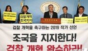 소설가 황석영, 시인 안도현 등 문학인 1276명이 7일 조국 법무부 장관을 지지하고 검찰 개혁 완수를 촉구하는 성명을 발표했다. ‘조국 지지 검찰 개혁을 위해 모인 문학인’은 이날 오전 국회 정론관에서 ‘조국을 지지한다. 검찰 개혁 완수하라’는 제목의 성명을 발표했다. 이들은 성명에서 “블랙리스트의 악몽이 아직도 생생한데 다시 자의적인 공권력의 폭주가 시작되는 것을 보고 불안과 분노를 느낀다”며 “검찰 개혁은 시대적 과제이자 촛불 민심의 명령임을 확인하기 위해 서명에 나섰다”고 밝혔다. 또 “‘조국 사태’는 그야말로 국민 관심 돌리기의 일환이라는 것이 우리들의 판단”이라며 “우리 문학인들은 검찰 개혁의 기수로 나서 수모를 당하는 조국 장관의 곁에서 그를 응원하고 검찰 개혁을 지지함을 분명히 밝힌다”고 했다. 소설가 황석영 정도상 공지영과 시인 안도현 이시영 장석남이 대표 발의한 서명은 지난달 25일부터 온라인으로 추진됐다. 서명에는 시인 정양 이상국 이동순 함민복 이윤학 이정록 나희덕 박성우 문신 김성규 박준, 소설가 이경자 양귀자 최인석 이병천 김연수 김현경 박문구 이기호 이만교 정찬 권여선 오수연, 평론가 신형철 하응백, 방송작가 송지나 등이 참여했다.김민 기자 kimmin@donga.com}