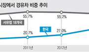 현대·기아자동차의 올해 내수 점유율이 70%를 밑돌 수 있다는 전망이 나오고 있다. 5일 자동차업계에 따르면 올해 1~11월 현대·기아차의 내수 점유율은 69.4%로 나타났다. 현대차는 41.7%, 기아차는 27.7%를 각각 차지했다. 올해가 한 달 남은 상황에서 현대·기아차의 점유율이 이 상태로 유지된다면 올해 점유율이 70%를 넘지 못하게 된다. 현대·기아차의 내수 점유율은 2006년 70.8%에서 2009년 76.8%까지 올라 최고점을 찍은 뒤 2012년 74.6%, 지난해는 71.4%까지 내려앉았다. 올해는 6월부터 내수 점유율이 60%대 후반 수준을 보이고 있다. 현대·기아차의 점유율이 내린 것은 수입차 시장이 커진 데다 신차 효과를 보지 못했기 때문이다. 올해 들어 지난달까지 수입차는 16만2280대가 팔려 이미 지난해 연간 판매량(15만6497대)을 넘어섰다. 반면 현대차는 신형 'LF쏘나타'의 판매량이 부진했고 '아슬란'의 10, 11월 판매량도 1559대에 그쳤다. 기아차의 신차 '카니발'과 '쏘렌토'는 파업 장기화의 영향으로 물량 공급이 제때 이뤄지지 않았다. 현대·기아차 관계자는 "연간 판매량 800만 대 목표를 달성하기 위해 12월 판촉을 강화하고 판매량을 늘리겠다"고 말했다.강유현 기자 yhkang@donga.com}
