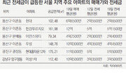최근 전세금이 크게 오른 서울지역 아파트 중 상당수의 전세금이 여전히 매매가의 절반을 밑도는 것으로 나타났다. 닥터아파트는 12∼19일 서울에서 전세가격이 1000만 원 이상 오른 77개 아파트 가운데 35%는 전세금이 매매가의 절반에도 못 미치는 것으로 조사됐다고 24일 밝혔다. 국민은행의 9월 전세가율(매매가 대비 전세금 비율) 자료에 따르면 서울 아파트 평균 전세가율은 53.3%로 한강 이남 11개구는 51.4%, 이북 14개구는 55.6%였다. 최근 부동산시장 침체로 집값은 내리막, 전세금은 오르막을 타는 추세가 지속되면서 서울 전세가율은 2011년 3월(46.4%) 이후 꾸준히 상승했다. 특히 최근 들어서는 일주일 만에 전세금이 1000만 원 넘게 오를 정도로 전세시장이 과열 양상을 보이고 있다. 서울 강남구 압구정동 ‘미성1차’ 아파트 공급면적 191m²의 전세금은 최근 1주일 새 2000만 원 뛴 6억500만 원에 이르지만 매매가격은 18억5000만 원으로 전세가율이 35%에 불과했다. 서울 용산구 이촌동 ‘한강푸르지오’ 아파트 공급면적 161m² 역시 5억 원이었던 전세금이 5억1500만 원으로 올랐지만 매매가 12억 원에 비하면 전세가율이 43%에 그쳤다. 전세금이 급등했지만 전세가율은 50%를 밑도는 주택형은 총 27개였고 지역별로는 강남구와 용산구가 각각 10개, 9개로 대부분을 차지했다. 이처럼 전세금이 급등해도 매매가의 절반을 넘지 못하는 것은 그만큼 주택가격이 비싸기 때문이라고 전문가들은 지적한다. 이영호 닥터아파트 연구소장은 “전세금이 고공비행을 하더라도 집값이 여전히 워낙 높아 전세의 매매 전환이 쉽지 않다”고 진단했다.장윤정 기자 yunjung@donga.com}