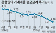 저금리 기조가 오랫동안 이어지면서 은행권의 가계대출 평균금리가 사상 처음 연 2%대로 떨어졌다. 한국은행이 28일 발표한 ‘4월 금융기관 가중평균금리’에 따르면 지난달 예금은행의 신규 취급액 기준 가계대출 평균금리는 2.96%로 전달(3.21%)보다 0.25%포인트 떨어졌다. 가계대출 금리는 1년 전인 2014년 4월에는 4.04%였지만 그 후 1%포인트 이상 급락했다. 4월 주택담보대출 금리는 2.81%로 전달(2.97%)보다 0.16%포인트 내렸다. 일반 신용대출 금리 역시 4.46%로 한 달 전보다 0.29%포인트 급락했다. 예금 금리도 가파르게 떨어지는 추세다. 지난달 신규 취급액 기준 예금은행의 저축성 수신 평균금리는 1.78%로 전달(1.92%)보다 0.14%포인트 하락했다. 정기예금 금리도 1.76%로 역대 가장 낮은 수준을 기록했다. 특히 4월에 가입된 정기예금 가운데 금리가 2% 미만인 비율은 92.1%나 됐다. 이 비율은 2월에 30.7%, 3월에 66.0%였다. 정기예금을 포함한 은행권의 예대 금리 지표는 관련 통계가 작성되기 시작한 1996년 이후 최근 거의 매달 사상 최저치를 경신하고 있다. 한은 관계자는 “3월 기준금리가 0.25%포인트 내려간 여파가 4월 시중금리에도 이어졌다”며 “당국의 저금리 안심전환대출 판매도 대출금리 하락에 영향을 줬다”고 설명했다.유재동 기자 jarrett@donga.com}