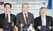 갈바도르 몽골 도시교통건설도시개발부 수석고문(가운데), 이승재 승화명품건설 대표(왼쪽), 임종학 KMGG 대표가 ‘몽골국립검진센터 및 뉴타운 아파트 건설’ 시공을 위한 양해각서를 11일 서울에서 체결했다. 승화명품건설 제공}