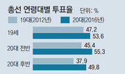 올해 20대 총선에서 ‘2030세대’의 투표율이 높아진 것으로 나타났다. 중앙선거관리위원회가 4일 발표한 ‘4·13총선 투표율 분석 결과’에 따르면 20대 후반(25∼29세)의 총선 투표율이 49.8%로 19대 선거보다 11.9%포인트 올랐다. 이어 20대 전반(20∼24세)이 55.3%로 9.9%포인트, 30대 전반이 48.9%로 7.1%포인트 올랐다. 상대적으로 야권 성향이 강한 20, 30대의 투표율 상승폭이 컸던 셈이다. 반면 50대는 19대 62.4%에서 20대 60.8%로 줄었고, 60대 이상의 경우 68.6%에서 68.7%로 비슷했다. 이는 전체 유권자의 10.4%에 해당하는 전국 436만5307명을 무작위 추출해 표본 조사한 결과다. 배종찬 리서치앤리서치 본부장은 “일자리 부족 등으로 정권에 실망한 젊은층이 전에 비해 투표장에 많이 나간 반면 장년층 이상은 막장 공천 등 정치권에 대한 실망으로 젊은층에 비해 투표장을 덜 찾은 것 같다”고 해석했다. 다만 2030세대의 투표율이 높아지긴 했지만 50% 안팎에 머물러 평균 투표율(58.0%)을 밑돌았다. 60대와 70대 투표율은 각각 71.7%, 73.3%로 평균 투표율을 크게 웃돌았다. 80대 투표율은 48.3%였다. 20대 총선 전체 투표율은 58.1%로 남성은 58.8%, 여성은 57.4%가 각각 투표에 참여했다. 시도별 투표율은 광역시 이상 8개 도시 중 세종시(63.5%)가, 도별로는 전남(63.7%)이 가장 높았다.신진우 기자 niceshin@donga.com}