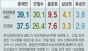 더불어민주당 문재인 대선 후보가 여론조사에서 국민의당 안철수 후보를 10%포인트 안팎으로 앞서는 결과가 발표됐다. 한국경제신문과 MBC가 리서치앤리서치에 의뢰해 21, 22일 전국 성인 1514명을 대상으로 조사해 23일 발표한 여론조사(95% 신뢰수준에 표본오차 ±2.5%포인트, 중앙선거여론조사심의위원회 홈페이지 참조)에 따르면 문 후보는 39.1% 지지율을 얻어 안 후보(30.1%)를 9%포인트 앞섰다. 조선일보가 칸타퍼블릭에 의뢰해 21, 22일 전국 성인 1030명을 대상으로 조사해 23일 발표한 여론조사(95% 신뢰수준에 표본오차 ±3.1%포인트)에서도 비슷한 결과가 나왔다. 이 조사에서 문 후보는 37.5%로 안 후보(26.4%)를 11.1%포인트 앞섰다. 유근형 기자 noel@donga.com}