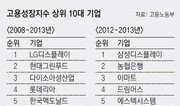 국내 기업 가운데 최근 5년간 일자리 창출 능력이 가장 높았던 기업은 LG디스플레이인 것으로 조사됐다. 국내 일자리 창출은 제조업 분야의 대기업이 주도해 왔지만 근로자 수 1만 명 이상 대기업들은 최근 5년간 청년 고용을 오히려 줄여온 것으로 나타났다. 고용노동부와 한국고용정보원은 이런 내용이 담긴 ‘기업 일자리 창출 지수(고용성장지수)’를 9일 발표했다. 고용성장지수는 개별 기업들의 일자리 창출 능력을 비교하기 위해 정부가 국내 최초로 만든 지수로, 공공부문을 제외한 전 업종(6개월 이상 고용보험을 가입한 근로자 100인 이상인 기업 8017곳)을 대상으로 산출했다. 한 기업이 창출해낼 수 있는 고용량을 고용증가인원과 고용증가율을 바탕으로 측정하며 ‘가젤기업(매출액 또는 고용이 빠르게 성장하는 기업)’ 선정에도 활용되고 있다. 분석 결과에 따르면 2008∼2013년 5년간 고용성장지수가 가장 높았던 기업은 LG디스플레이였고, 현대그린푸드 다이소아성산업 롯데리아 한국맥도날드 등이 뒤를 이었다. 분석 기간을 1년(2012∼2013년)으로 한정하면 삼성디스플레이가 가장 높았고, 농협은행 이마트 드림어스 에스텍시스템 순이었다. 국내 대표기업인 삼성전자는 5년 기준 32위, 1년 기준 98위에 머물렀고, 현대자동차는 1년 기준으로는 6위였지만 5년 기준에서는 35위에 머물렀다. 다만 LG전자는 5년 기준 11위, 1년 기준 9위로 상위권에 위치해 눈길을 끌었다. 고용부는 “분석기간에 상관없이 전체 기업의 60% 이상이 고용을 늘렸다”며 “분석기간이 길어질수록 대기업보다는 중소기업의 고용 증가가 눈에 띄는 것이 특징”이라고 설명했다. 고용 증가 기업의 업종별 분포는 제조업이 37.0%로 가장 많았고, 사업시설 관리 및 사업지원 서비스업(13.5%), 운수업(8.5%) 등의 순이었다. 특히 2012∼2013년에는 근로자 수 5000명 이상인 기업의 90%가 고용을 늘린 것으로 나타나 제조업 분야 대기업이 최근의 일자리 창출을 주도하는 것으로 조사됐다. 또 고용성장지수 상위 100대 기업이 전체 일자리의 30% 이상을 창출하는 것으로 나타났고, 새롭게 창출된 일자리는 여성보다는 남성(58.9%)이 많았고, 연령대로는 30∼54세(65.7%)가 절반을 넘었다. 대기업이 청년층(15∼29세) 채용에 적극적이지 않다는 사실도 이번 조사에서 확인됐다. 2008∼2013년 5년간 1만 명 이상 대기업의 청년층 고용증가 비중은 ―17.8%, 2010∼2013년 3년간은 ―8.0%로 오히려 청년 고용을 줄여온 것으로 나타났다. 다만 2012∼2013년에는 23.4%로 회복세를 보였다. 또 최근 5년간 청년 고용을 많이 늘린 분야는 상대적으로 비정규직이 많은 교육서비스업(54.1%), 숙박 및 음식점업(49.3%) 등이었다. 청년들이 대기업 취업이 여의치 않다 보니 숙박, 음식, 교육서비스업 등으로 몰리는 것으로 분석된다. 정형우 고용부 노동시장정책관은 “청년 고용에 적극적일수록 고용성장지수가 높은 특징을 보이고 있지만 대규모 기업들은 오히려 청년 고용을 줄이는 추세”라며 “인력공급 등 사업지원 서비스업에서 고용 성장이 두드러지는 것 역시 최근 간접고용이 증가하는 추세를 보여주는 것”이라고 말했다.유성열 기자 ryu@donga.com}