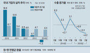 엔화 약세로 인한 수출 둔화와 내수 침체 등의 여파로 한국 기업들의 수익성이 역대 가장 낮은 수준까지 떨어졌다. 올 1분기(1∼3월) 성장률도 4개 분기 연속 0%대에 머물며 저성장이 장기화되는 국면에 접어들었다. 한국은행은 23일 국내 1731개 기업의 작년 매출액 증가율이 전년도 0.7%에서 ―1.5%로 떨어졌다고 밝혔다. 전년에 비해 매출액이 줄어든 것은 글로벌 금융위기 직후였던 2009년(―0.1%) 이후 처음이다. 기업들의 수익성을 나타내는 매출액 영업이익률도 지난해 4.3%로 하락해 관련 통계가 작성되기 시작한 2003년 이후 가장 낮았다. 한은은 이날 1분기 실질 국내총생산(GDP)이 전기(前期) 대비 0.8% 증가했다고 발표했다. 분기별 성장률은 지난해 1분기에 1.1%로 올랐지만 이후 4개 분기 동안 0%대의 늪에서 벗어나지 못하고 있다. 전년 동기 대비로는 1분기에 2.4% 성장에 그쳐 2013년 1분기 이후 2년 만에 가장 낮았다. 이날 외환시장에서 원-엔 재정 환율은 장중 한때 100엔당 902원 선까지 하락(원화 가치는 상승)했다.유재동 기자 jarrett@donga.com}