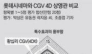 ‘좌석이 흔들리고, 바람이 불고, 안개가 깔리고….’ 3D 화면에 스크린 속 상황에 맞춰 각종 자극을 추가한 4D 상영은 극장 별로 얼마나 차이가 날까. 영화를 공부하고 있는 박상은 씨(28), 단편영화 제작 경험이 있는 유동권 씨(26), 영화 마니아인 대학원생 곽지윤 씨(25)와 기자가 25일 롯데시네마 청량리관(수퍼4D)과 CGV 왕십리관(4DX)에서 ‘매드맥스: 분노의 도로’를 함께 보고 4D 시스템을 비교해봤다. 25점 만점 (5개 항목, 각 5점)으로 점수를 매겨본 결과 왕십리관이 20점, 청량리관이 17점을 받았다. 왕십리관은 특수효과의 풍부함과 몰입감 등 평가 항목에서 점수가 높게 나왔다. 유 씨는 “여주인공 퓨리오사의 발에 쇠사슬을 걸어 넘어뜨릴 때 발목을 줄(티클러)로 쳐서 걸린 듯한 느낌을 줬고 얼굴 등에 불어오는 바람의 세기나 횟수, 방향이 장면에 따라 다양해 실감났다”고 말했다. 좌석 이동의 박진감은 두 극장이 모두 “나쁘지 않다”는 평가를 받았다. 박 씨는 “자동차 충돌 장면 등에서 좌석의 움직임이 느낌을 적절하게 전달했다”고 말했다. 그러나 일부 장면에서는 관객의 생각과 무관하게 좌석이 움직였다는 지적도 있었다. 곽 씨는 “차의 회전방향과 반대로 좌석이 기울어지거나, 멀리서 차가 지나가는 것을 보여주는 장면에서도 좌석이 흔들리는 것은 과하게 느껴졌다”고 말했다. 좌석의 진동감은 청량리관이 평가가 좋았다. 박 씨는 “청량리관은 영화 중 차의 시동이 거칠게 걸릴 때 좌석에 강한 진동을 줘 극중의 거친 느낌이 제대로 전달됐다”고 말했다. 일부 4D 기술은 불필요하거나 불편했다. 곽 씨는 “등장인물이 총에 맞을 때 피격 부위와 관계없이 엉덩이(청량리관)나 등(왕십리관)을 ‘쿡’하고 찌르는 것은 영화 몰입을 방해했다”고 말했다. 주인공이 물에 빠지는 장면 등에서 얼굴에 물이 분사되는 것도 호불호가 엇갈렸다. 기자의 경우 안경을 닦아야 해 영화 흐름을 순간 놓치는 점이 불편했다. 같은 극장 체인이라도 설치된 시기와 모델에 따라 4D시설의 수준이 다르다. 롯데시네마 관계자는 “청량리관은 롯데시네마 상영관 중 처음 4D가 설치된 초기 모델이고 이후 설치된 롯데월드 타워관과 수원관 등에는 최신의 시스템이 적용돼 있다”며 “청량리관도 조만간 시설을 업그레이드할 예정”이라고 말했다.조종엽 기자 jjj@donga.com}