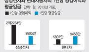 ‘발 빠른 삼성전자, 노조에 발목 잡힌 현대자동차.’ 1인당 생산성과 평균임금 추이를 분석한 결과 국내 재계 1, 2위 그룹의 대표 기업인 삼성전자와 현대차 간에 뚜렷이 다른 패턴이 나타났다. 삼성전자는 생산성이 떨어지면 발 빠르게 임금을 낮추고 인력 감축에 들어간 반면 현대차는 생산성이 떨어져도 임금은 계속 인상한 것으로 조사됐다. 삼성전자의 2012년 직원 수는 9만700명으로 2011년에 비해 1만1270명(11.1%) 줄었다. 이는 2011년에 직원 1인당 영업이익과 당기순이익이 2010년보다 각각 26.4%, 28.9% 하락하면서 생산성이 급감한 탓으로 풀이된다. 2012년에는 직원 수뿐 아니라 평균임금도 600만 원 줄어든 7150만 원에 그쳤다. 하지만 지난해 역대 최고 실적을 올리면서 생산성이 크게 향상되자 삼성전자 직원의 평균임금은 9995만 원까지 올랐다. 성과를 낸 만큼 돌려준다는 보상의 원칙이 그대로 적용되고 있는 것이다. 반면 현대차의 1인당 영업이익은 2011년 8370만 원으로 정점을 찍은 뒤 지난해에는 5897만 원까지 하락했다. 그러나 평균임금은 매년 증가해 지난해에는 2009년보다 2000만 원가량 올랐다. 권순원 숙명여대 경영학부 교수는 “시장의 수요 변동과 추가 투자 등 다른 요인을 배제하고 본다면 삼성전자는 생산성 하락에 대해 적극적으로 대처한 반면 현대차는 그렇지 못했다”며 “현대차는 노조가 있어 즉각적인 대처가 어렵고 향후 사내하도급 인력을 정규직으로 추가 채용하면 1인당 생산성은 더 저하될 수 있다”고 말했다. 이 때문에 일각에서는 올 3분기(7∼9월)에 실적이 저조할 것으로 예상되는 삼성전자가 인력 구조조정에 들어가는 게 아니냐는 전망도 나온다. 오일선 한국CXO연구소장은 “과거 삼성전자의 실적과 직원 추이를 봤을 때 영업이익이 연간 3000억 원 정도 감소하면 인력이 평균 1000명 내외 줄어드는 것으로 나타났다”고 말했다.정세진 mint4a@donga.com·강유현 기자}