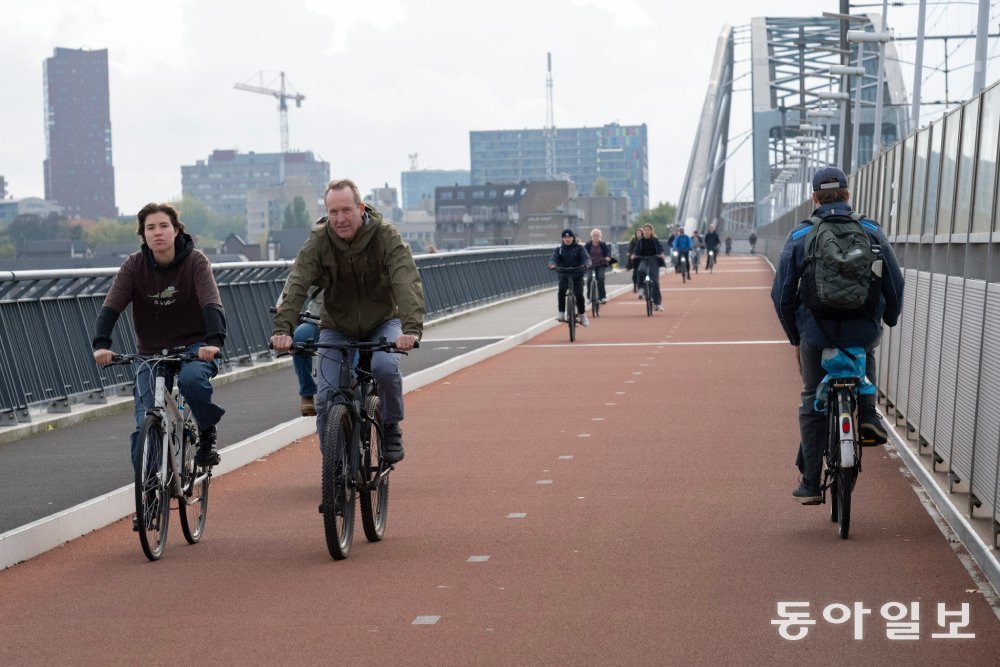 “이곳에서 자동차는 손님일 뿐입니다. 시속 30km 이상으로 달릴 수 없죠.”지난달 22일 오후 네덜란드 로테르담. 비영리기관 델프트도로안전과정(DRSC)의 테이어 호리스 총괄이 주택가 입구를 가리키며 말했다. 그가 가리킨 곳엔 시속 30km 제한 표지판이 있었고, 뒤로는 검은 아스팔트 대신 붉은 벽돌이 깔린 자전거 도로가 이어졌다. 호리스 총괄은 “자동차 통행이 허용되지만 우선권은 어디까지나 자전거 이용자에게 있다”고 말했다.● 혈관처럼 이어진 자전거도로인구 약 1800만 명에 자전거 2400만 대로, 1명당 1.3대를 보유한 네덜란드에선 어딜 가든 붉은 자전거도로가 먼저 눈에 띄었다. 교차로에서도 끊이지 않고 이어지며 한적한 시골길까지 뻗은 자전거도로는 마치 혈액을 온몸 구석구석으로 나르는 ‘핏줄’처럼 촘촘했다. 기자가 호리스 총괄과 로테르담 일대를 돌아본 이날도 자동차보다 자전거를 찾기가 더 쉬웠다. 차는 자전거가 지나갈 때까지 멈춰 서는 모습이 자연스러웠다.네덜란드는 1970년대부터 주택가 등 생활도로에서 자동차 속도를 낮추고 자전거 이용을 확대하는 정책을 일관되게 펴 왔다. 그 결과, 네덜란드 교통안전연구소(SWOV)에 따르면 1972년 3264명이었던 사망자 수는 지난해 675명으로 줄었다. 50여 년 만에 5분의 1 수준으로 줄어든 것이다. 이는 안전뿐 아니라 교통 효율을 높이는 데도 크게 기여했다. 네덜란드 자전거친선협회 조사를 보면 네덜란드의 자전거 교통 분담률은 약 27%다. 이동 거리 7.5km 이하인 시내 통행으로 좁혀 보면 33%로 올라가고, 암스테르담이나 위트레흐트 등 일부 도시는 50%를 넘어선다.● 주거지 전체가 ‘시속 30km’네덜란드는 도로 유형을 크게 생활도로와 집산도로, 통과도로(고속도로)로 나눈다. 주택이 밀집한 생활도로는 거의 예외 없이 시속 30km의 제한속도를 적용한다. 한국의 어린이보호구역과 유사하지만 지역 전체가 시속 30km로 묶인다는 점이 다르다. 일방통행로가 많은 것도 차량 흐름을 자연스럽게 제한하기 위한 설계다. 호리스 총괄은 “차가 멀리 우회하게 해 보행자와 자전거 이용자를 보호하는 것”이라고 설명했다. 최근에는 도심 전체를 시속 30km로 낮추는 절차도 진행 중이다.주거지를 벗어나면 생활도로와 고속도로를 잇는 집산도로가 나온다. 제한속도는 주로 시속 50km이며, 트램과 버스 등 다양한 교통수단이 뒤섞인다. 자전거도로는 연석이나 조경수, 주차 공간, 가드레일 등 구조물로 차로가 구분된다. 호리스 총괄은 “큰 사고를 낼 정도로 차가 빠르게 달리는 곳에서는 자동차와 자전거가 마주칠 가능성 자체를 없애도록 설계했다”고 말했다.기자가 직접 자전거로 로테르담 일대를 돌아보니 한 번 올라탄 자전거도로가 목적지까지 끊김이 없이 이어졌다. 모든 교차로에 자전거 전용 신호등이 별도로 설치돼 있었다. 고속도로 옆에도 자전거도로가 나란히 조성돼 있었고, 허리 높이의 가드레일로 차량과 분리해 한국보다 보호 수준이 높았다.네덜란드에서 자전거는 기차나 버스, 트램과 더불어 어엿한 교통수단으로 대접받는다. 전국 기차역에 마련된 대규모 자전거 주차장과 네덜란드 철도공사가 운영하는 공공자전거 시스템 덕이다. ‘자전거→기차→자전거’ 이동이 매끄럽게 이뤄진다. 네덜란드 자전거친선협회의 크리스 브륀틀럿 국제협력 매니저는 “자전거와 기차가 결합하면 50∼100km 이동도 자동차와 경쟁할 수 있다”며 “네덜란드에서 자전거는 ‘바퀴 달린 걷기’에 가깝다”고 말했다.● ‘아동 살해를 멈춰라’가 만든 교통 혁신처음부터 ‘자전거 천국’이었던 건 아니다. 제2차 세계대전 이후 도시를 재건할 땐 자동차가 중심이었다. 자동차가 보급되면서 교통사고 사망자도 증가했다. SWOV에 따르면 1972년 교통사고 사망자 3264명 중 450명은 어린이였다.이 무렵 한 현지 언론인이 등교 중 딸을 잃고 신문에 ‘아동 살해를 멈추라’는 칼럼을 썼다. 이 글을 계기로 전국적인 제도 개선 요구 시위가 촉발됐다. 브륀틀럿 매니저는 “이때부터 네덜란드의 교통체계는 자동차가 ‘마지막 선택지’가 되도록 방향을 틀었다”고 설명했다.이 흐름을 떠받치는 철학이 바로 ‘지속 가능한 안전’이다. SWOV의 레티 아르츠 연구원은 “사고의 책임을 사람에게 돌리는 게 아니라 ‘실수가 반복되도록 방치한 시스템’에 묻는 것”이라고 설명했다. 차로와 자전거도로를 물리적으로 분리하고, 여러 교통수단이 뒤섞이는 곳에서는 차량의 제한속도를 낮춰 자전거와 보행자의 안전을 보장하는 게 이에 해당한다.아르츠 연구원은 “자전거 이용량과 함께 관련 사고가 늘면서 2010년대 이후 교통사고 사망자 감소세가 정체한 점은 네덜란드가 안은 숙제”라고 했다. 그는 “이미 시스템을 만들었다고 안심할 수 없다”며 “네덜란드는 지금도 무엇을 더 혁신할 수 있을지 끊임없이 점검하고 있다”고 말했다.“강 아래 터널-공중 로터리까지”… 곳곳에 자전거 전용 인프라자전거 고속도로 달려보니15㎞도 45분 만에 주파“자동차 못잖은 이동수단”네덜란드는 다른 나라에서 보기 어려운 특별한 자전거 인프라를 다수 갖추고 있다. 중부 도시 위