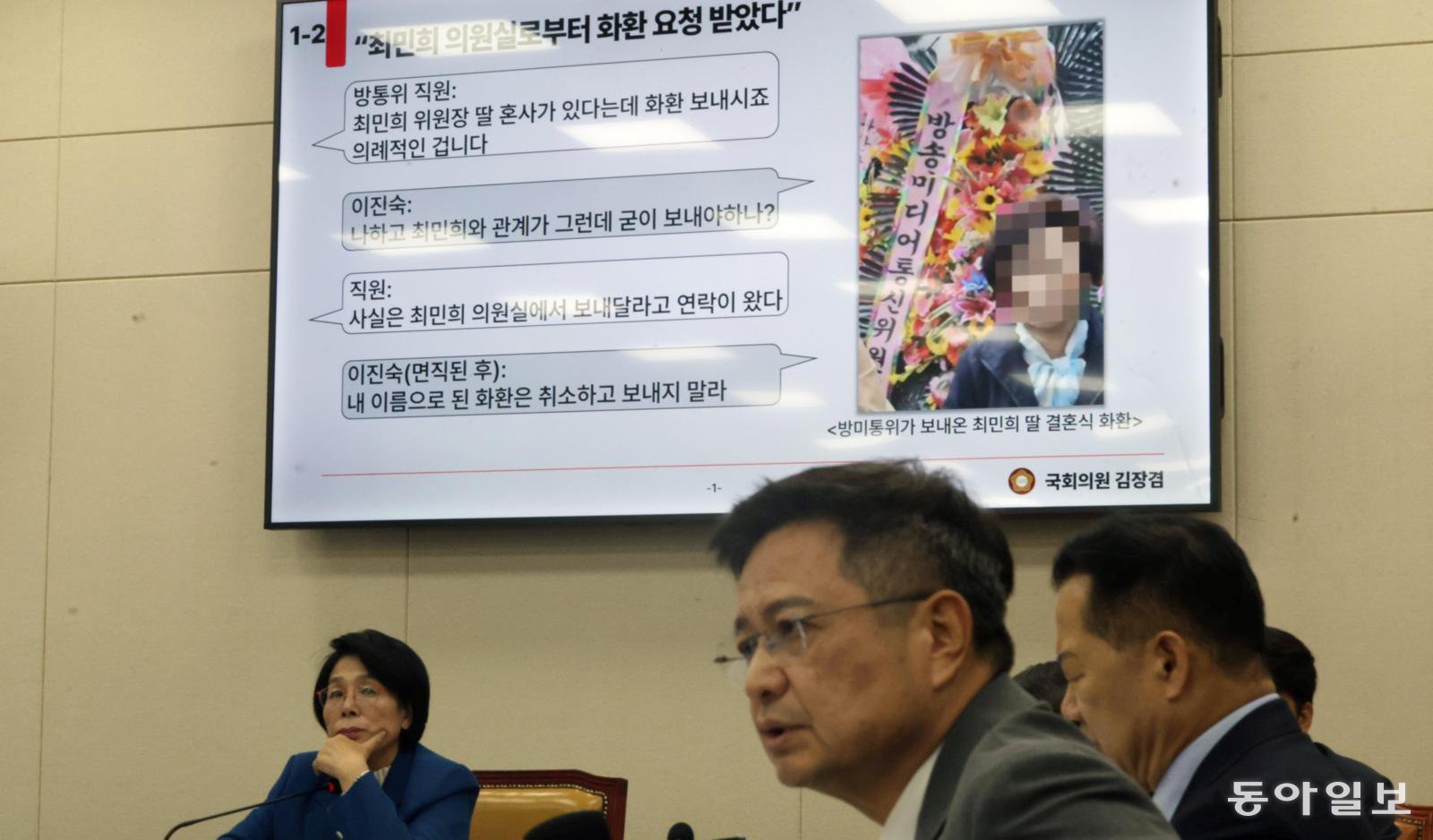 23일 국회 과학기술정보방송통신위원회의 MBC 대주주인 방송문화진흥회(방문진) 국정감사에서 더불어민주당 소속 최민희 과방위원장이 20일 MBC 박장호 보도본부장을 퇴장시킨 것이 거듭 논란이 됐다. 최 위원장은 23일 “앞으로도 필요하다면 국회에서든 어디서든 계속 지적할 것”이라며 정당한 조치였다는 입장을 고수했지만 원내 지도부에서는 최 위원장의 과방위 운영에 대해 “심각하게 보고 있다”는 목소리가 나왔다.국민의힘 박충권 의원은 이날 과방위의 방문진과 KBS, EBS 등 국정감사에서 권태선 방문진 이사장에게 “(최 위원장이) 자신과 관련된 개별 기사를 언급하면서 격한 감정을 드러내고 실무자 퇴장 명령을 한 것은 피감기관 실무 책임자에 대한 명백한 겁박”이라며 “권력을 남용한 부당한 보도 개입 아니냐”고 물었다.권 이사장은 “개별 보도 사안에 대해서는 질문을 자제해 온 게 국회 관행”이라며 “유감스러운 일”이라고 했다. 그러자 최 위원장은 “권 이사장의 유감 표명을 받아들이고 성찰하겠다”면서도 “그날 국민의힘 의원들은 심지어 화면에 개별 보도를 다 띄워 놓고 ‘친(親)민주(당 보도)’라고 했다”고 비판했다. 또 소셜미디어에 올린 입장문에선 “국회 회의에서 필요하다고 판단한 문제 지적을 할 뿐”이라고 했다.하지만 민주당 문진석 원내운영수석부대표는 기자들과 만나 “당에서도 심각하게 보고 있다”며 “조만간 (김병기) 원내대표의 의견 표명이 있을 것”이라고 우려를 표명했다.국민의힘 소속 과방위원들은 이날 최 위원장을 직권 남용, 방송법 위반 혐의로 고발하겠다고 밝히면서 과방위원장직 사퇴를 촉구했다.이날 국감에서 국민의힘 김장겸 의원은 최 위원장 의원실에서 딸 결혼식에 화환을 보내 달라고 이진숙 전 방송통신위원장에게 요청했다는 의혹을 제기했다. 이 전 위원장은 통화에서 “방통위 직원이 ‘최민희 의원실 보좌관’으로부터 연락을 받았다고 했다”고 주장했다. 앞서 최 위원장은 국감 기간 딸 결혼식이 국회에서 열린 데 대한 비판에 피감기관에 일절 연락한 적이 없다고 했다. 최 위원장 보좌관도 “화환 관련해 아무에게도 요청한 적 없다”며 “문의받은 적도 없다”고 했다.조권형 기자 buzz@donga.com}