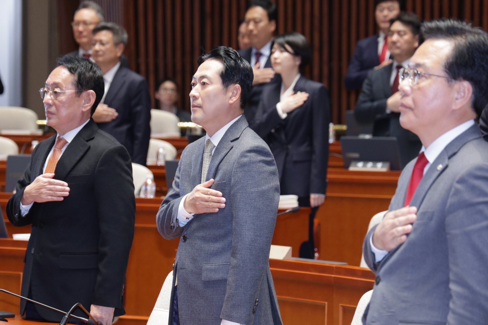 “범죄자다!” “재판을 속개하라!” 국민의힘은 이재명 대통령이 4일 국회에서 진행한 내년도 예산안 시정연설에 참석하지 않은 채 국회 로텐더홀 계단에서 ‘야당 탄압 규탄대회’를 열었다. 전날 내란 특검(특별검사 조은석)이 추경호 전 원내대표에 대해 구속영장을 청구한 것을 야당 탄압이자 ‘정당 해산 전초전’으로 규정하고 시정연설을 보이콧한 것이다. 야당이 대통령 시정연설을 보이콧한 것은 2022년 10월 더불어민주당이 윤석열 전 대통령의 시정연설에 불참한 이후 3년 만이다. 이날 국민의힘 의원들은 검은색 마스크·넥타이에 검은 계열의 옷을 입고 가슴에 ‘자유민주주의’가 적힌 근조 리본을 단 채 로텐더홀을 가득 메웠다. 맨 앞에 선 장동혁 대표와 송언석 원내대표 등은 영정 사진을 본뜬 ‘근조 자유민주주의’ 팻말을 들었고, 다른 의원들은 ‘야당탄압 불법특검’ ‘명비어천가 야당파괴’ 등이 적힌 손팻말을 들었다. 오전 9시 39분경 국회에 도착한 이 대통령이 국회로 들어서자 국민의힘 의원들은 “범죄자가 왔다!” “꺼져라!” 등을 외치며 항의했다. 마중을 나간 우원식 국회의장을 향해서도 “정신 차려라!” “입법부 수장이 쪽팔리지도 않냐” 등의 고성을 쏟아냈다. 이 대통령은 장 대표 등에게 고개를 숙여 짧게 목례한 뒤 별다른 말 없이 본회의장으로 이동했다. 장 대표는 앞선 의원총회에서 “이제 전쟁이다. 이제 우리가 나서서 이재명 정권을 끌어내리기 위해 모든 힘을 모아야 할 때”라며 “이번이 마지막 시정연설이 되어야 한다”고 말했다. 이 대통령이 국회의원이던 2022년 9월 김현지 당시 보좌관(현 대통령제1부속실장)이 “의원님 (검찰) 출석요구서가 방금 왔습니다. 전쟁입니다”라고 문자메시지를 보낼 때 쓴 ‘전쟁’ 표현을 똑같이 사용한 것이다. 송 원내대표도 의원총회에서 “일당독재로 나아가겠다는 무도한 이재명 정권에 맞서서 수단과 방법을 가리지 않고 끝까지 싸우겠다”고 했다. 장 대표 등 지도부는 시정연설에 앞서 이 대통령과 우 의장, 여야 대표단이 참석하는 사전 환담회에도 불참했다. 대통령실에 따르면 장 대표는 시정연설 이후 간담회에도 불참했다. 이 대통령은 시정연설을 시작하면서 텅 빈 국민의힘 의원석을 바라보며 “좀 허전하군요”라고 말했다. 민주당 의원들은 이 대통령이 본회의장에 입장하자 일제히 기립해 박수를 치며 이 대통령을 맞았다. 이 대통령의 연설 중에는 총 33번의 박수를 보냈고, 연설이 끝나자 “이재명 대통령”을 20여 차례 연호하기도 했다.이채완 기자 chaewani@donga.com}