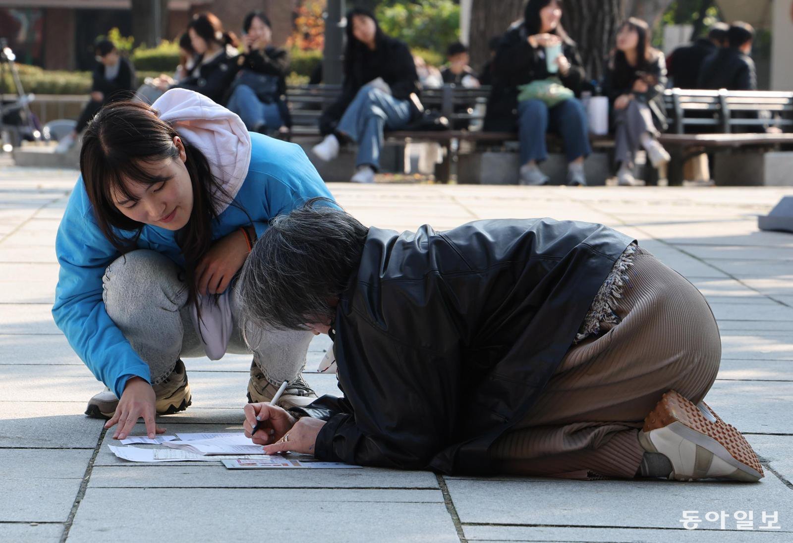 29일 오후 서울 종로구 마로니에공원에서 열린 ‘제43회 마로니에 여성 백일장’에서 한 참가자가 바닥에 엎드린 채 산문을 쓰고 있다. 강원 강릉시에서 왔다는 이 참가자는 “꼭 내 글을 내고 싶었다”며 마지막으로 산문을 제출했다. 변영욱 기자 cut@donga.com}