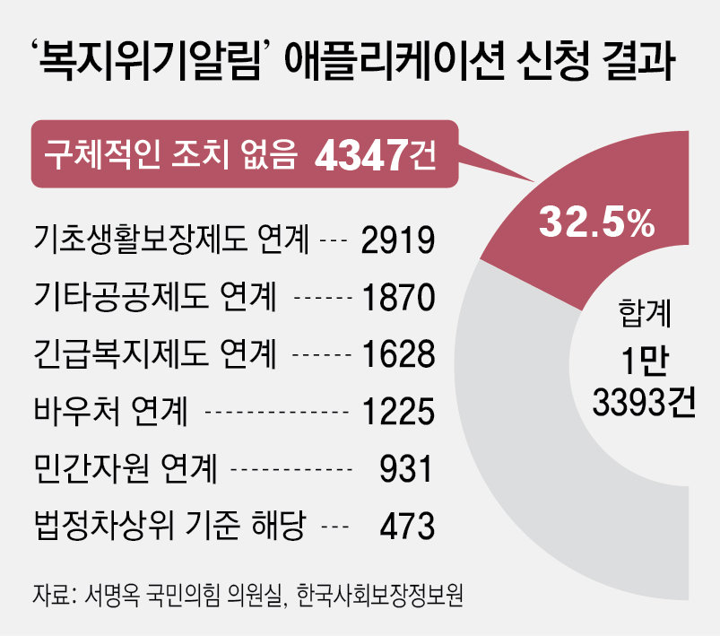 한국사회보장정보원이 운영하는 ‘복지위기 알림’ 애플리케이션에 접수된 10건 중 3건은 구체적인 조치를 하지 않은 것으로 나타났다. 복지위기 알림 앱은 자신이나 이웃이 위기에 처했을 때 관련 사항을 정부, 지방자치단체에 전달할 수 있는 앱이다. 연간 3억 원이 투입되는 사업이지만 성과가 크지 않고 역할도 보건복지부의 129콜센터와 비슷하다는 지적이 나온다.● 복지위기 신고 10건 중 3건 ‘조치 없음’20일 국회 보건복지위원회 소속 서명옥 국민의힘 의원이 정보원으로부터 받은 ‘복지위기 알림 앱 관련 자료’에 따르면 지난해 4월 시범운영을 시작한 뒤 올해 8월까지 복지위기 알림 앱에 접수된 위기 알림 신고는 1만3393건이었다. 정식 개통이 지난해 6월 26일이었다는 점을 감안하면 14개월 동안 한 달에 약 960건이 접수된 셈이다.복지위기 알림 앱은 경제적 어려움, 건강 문제, 고립·고독 등 개인의 위기 상황을 휴대전화를 통해 신속하게 외부에 알릴 수 있도록 만들어진 앱이다. 2023년 과학기술정보통신부 예산 19억8700만 원으로 개발됐으며 현재는 정보원이 운영비와 시스템 이용료 등 연간 3억2700만 원의 예산으로 운영하고 있다. 위기 상황이 접수되면 신고 지역을 파악해 해당 내용이 관할 지자체로 연계되는 방식이다. 정보원은 이웃집 앞에 쌓인 신문이나 우편함 체납고지서 등 위기 감지 정황만으로 도움을 요청할 수 있다고 홍보했다.그러나 앱에 접수된 위기알림 신고 중 구체적인 조치 결과가 없는 사례는 4347건(32.5%)에 달했다. 앱에 신고가 접수됐으나 장기간 조치중인 사례도 190건이었다. 이 중에는 이혼 후 양육비를 받지 못한 채 홀로 자녀를 키우는 여성이 자신이 받을 수 있는 복지급여를 문의한 사례, 강제 퇴거할 위기에 놓인 이웃 독거 노인을 위한 도움을 요청한 사례 등이 포함됐다.복지위기가 접수된 뒤 내려진 조치는 기초생활보장제도 연계(2912건·21.8%)가 가장 많았다. 이어 지역공동체 일자리 알선 등 기타 공공제도 연계(1870건), 긴급복지 연계(1628건), 바우처 연계(1225건), 민간자원 연계(931건), 법정차상위 기준 해당(473건) 등의 순이었다.● “복지부 129콜센터와 서비스 비슷”일부 이용자들은 복지위기 알림 앱에 대해 부정적으로 평가하기도 한다. 한 이용자는 온라인에 “위기알림 신청 10일이 지나도 계속 접수 상태로 남아 있고, 재신청을 해야만 해당 부서로 연결했다는 메시지가 온다”며 “위기상황에 놓은 사람이 극단적 선택을 해야 변명할 거냐”고 후기를 남겼다. 정보원은 대부분의 불만 리뷰에 ‘지자체에 문의해야 한다’고 답변했다.복지위기 알림 앱은 이와 별도로 운영 중인 복지부 129 콜센터와 서비스 내용이 비슷하다는 지적도 나온다. 복지부 콜센터는 긴급복지지원, 복지사각지대, 노인 및 아동학대, 정신건강 상담 등 다양한 복지서비스에 대한 안내를 한 번에 제공하며 앱도 운영 중이다. 정보원 관계자는 “구체적인 조치가 없는 경우는 현재 처리 중이거나, 상담 결과 기존에 서비스를 지원받고 있어서 추가 서비스를 제공하기 어려운 경우, 안내만 하고 끝난 경우 등이 포함된다”며 “신고 내용에 자살 등 특정 키워드가 포함되면 자동으로 129 콜센터로 연계된다”고 설명했다. 서 의원은 “복지위기 알림 앱이 보여주기식 사업으로 전락했다”며 “기존 사업과 중복된 부분이 있는 만큼, 앱 전반에 대한 개선이 시급하다”고 지적했다.조유라 기자 jyr0101@donga.com}