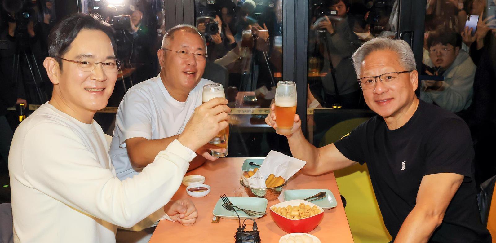 한국 치킨집에서 한국과 미국 대표 기업들의 인공지능(AI) ‘깐부 동맹’이 결성됐다. 젠슨 황 엔비디아 최고경영자(CEO)와 이재용 삼성전자 회장, 정의선 현대자동차그룹 회장이 30일 서울 강남구의 한 치킨 가게에서 만나 3자 ‘치맥(치킨+맥주)’ 회동을 가졌다. 이날 만남은 같은 날 인근에서 열린 엔비디아 행사장까지 총 3시간가량 이어졌다.● 파격적인 기업 총수들의 회동이날 회동은 파격 그 자체였다. 황 CEO가 “오늘은 내 인생 최고의 날”이라고 말할 정도였다. 엔비디아와 삼성전자, 현대·기아차 등 시가총액을 모두 합치면 약 8300조 원에 이르는 글로벌 기업의 총수 3명이 서울 강남구 삼성역 인근 ‘깐부치킨’ 매장을 찾아 수백 명의 시민들 앞에서 공개 치맥을 즐겼다.황 CEO는 이날 입국 뒤 오후 7시 20분경 정 회장과 함께 치킨집에 들어섰다. 특유의 검은 가죽점퍼와 반팔 검은티 차림이었다. 이 회장은 5분가량 늦게 도착해 황 CEO와 포옹했다. 이 회장과 정 회장 역시 편한 흰색 티셔츠를 입었다.이번 회동은 황 CEO가 한국의 치맥 문화를 체험하고 싶어해 진행됐다. 황 CEO는 프라이드치킨, 골뱅이무침, 치즈스틱 등을 안주로 시켜 이 회장, 정 회장과 나눠 먹었다. 이들은 맥주를 마시다 옆 테이블에 있던 소주와 맥주를 섞는 장치인 ‘소맥 타워’로 만든 소맥을 여러 잔 마시기도 했다. 세 사람은 팔을 교차해 술을 마시는 ‘러브샷’도 했다.황 CEO가 “오늘 저녁을 쏘겠다(Dinner is Free)”라고 외치자 정 회장이 “2차는 제가 쏘겠습니다”라고 답했다. 다만 실제 계산은 이 회장이 한 것으로 전해졌다. 이날 해당 매장의 전체 테이블 식사비는 약 250만 원 나온 것으로 알려졌다.● 한밤 3시간 이어진 깐부 동맹 이날 회동에서 글로벌 기업 총수들의 소탈한 모습이 고스란히 생중계됐다. 황 CEO는 식사 도중 시민들에게 김밥, 바나나우유와 치킨 등을 나눠 주기 위해 자리를 비웠다. 그사이 이 회장이 “치맥 먹는 거 한 십 년 만인 것 같다”고 말하자 정 회장은 “난 자주 먹는다”고 답했다. 황 CEO는 이 회장과 정 회장에게 700만 원 상당인 일본 하쿠슈25년 위스키와 자사 ‘DGX 스파크’ AI 슈퍼컴퓨터 등을 선물했다. 선물에는 “우리의 파트너십과 세계의 미래를 위해!(TO OUR PARTNERSHIP AND FUTURE OF THE WORLD!)”라고 적은 뒤 사인했다.매장 상호명인 ‘깐부’가 친한 친구를 뜻한다는 점과 넷플릭스 드라마 ‘오징어게임’에서 “우리는 깐부잖아”라는 대사로 유명해진 점에서 이번 장소를 결정했다는 해석도 나왔다. 황 CEO는 “나는 친구들과 치맥을 즐기는 걸 좋아한다. 그래서 깐부는 완벽한 장소”라고 말했다. 황 CEO는 치킨 매장에서 “너무 좋고 행복하다(So good. So Happy)”라고 몇 차례 말했다. 이 회장 역시 치킨 매장을 떠나며 “살아보니까 행복이라는 게 별것 없어요. 좋은 사람들끼리 맛있는 것 먹고 한잔하는 그런 게 행복”이라고 했다. 오후 8시 40분까지 1시간 20분가량 이어진 이들의 한밤 치맥 회동은 인근 서울 강남구 코엑스에서 엔비디아 주최로 열리던 ‘지포스 게이머 페스티벌’로 이어졌다.황 CEO는 게이머 페스티벌에서 시민들과 만나 “AI가 모든 산업을 바꿀 것이며, 인류 역사상 가장 큰 단일 산업이 될 것”이라며 “엔비디아의 미래와 AI의 미래는 매우 밝을 것”이라고 말했다. 전날인 29일(현지 시간) 뉴욕 증시에서 엔비디아 주가는 최고치인 207.04달러에 거래를 마쳐 역사상 처음 시가총액 5조 달러(약 7410조 원)를 돌파해 세계 3위 경제대국인 독일의 경제규모(국내총생산·GDP)를 뛰어넘었다. 총수 3명은 코엑스 페스티벌 무대에도 함께 올랐다. 황 CEO는 마치 록스타처럼 이 회장과 정 회장을 소개했다. 소개받은 이 회장은 ‘이재용’을 외치는 관객들에게 “감사하다. 그런데 아이폰이 왜 이리 많냐”고 농담하기도 했다. 황 CEO는 이건희 삼성 선대회장으로부터 받은 편지도 소개했다. 그는 “1996년 제 인생 처음으로 한국에서 편지를 받았다. 그 편지 내용은 한국을 초고속 인터넷으로 연결하고, 앱을 만들고, 나의 지원을 받고 싶다는 것이었다”며 “그게 한국에 온 첫 계기”라고 말했다. 이 회장은 이에 대해 “제 아버지가 보낸 편지”라고 답했다. 이들은 무대 앞에 모인 관객들에게 엔비디아 선물 티셔츠까지 함께 나눠 준 뒤인 오후 10시경이 되어서야 헤어졌다.● 엔비디아-한국 기업 ‘AI 동맹’ 체결 전망이번 회동은 31일 엔비디아와 국내 기업 간 대규모 AI 반도체 계약을 앞두고 추진한 자리였다. 황 CEO는 같은 날 경북 경주시에서 열리는 아시아태평양경제협력체(APEC) CEO 서밋에 참석해 특별 연사로 나설 예정이다. 경주 현장에서 엔비디아와 국내 기업 간 대규모 AI 반도체 협력에 대한 발표가 나올 것으로 보인다.재계에 따르면 엔비디아는 한국 정부 및 삼성전자, SK, 현대차, 네이버 등과 거대 ‘AI 동맹’을 맺고 최신 GPU 블랙웰 등 AI칩 수십만 개 이상의 물량을 공급할 계획이다. 금액으로 따지면 10조 원 이상 규모가 될 것으로 보인다. 황 CEO는 “31일 한국의 이재명 대통령을 만나기를 기대하고 있다”며 “엔비디아가 한국에서 여러 가지를 준비하는 만큼 내일 좋은 소식과 함께 여러 