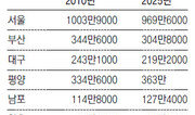 2025년에는 평양이 부산을 제치고 한반도에서 서울에 이어 인구가 많은 도시가 될 것으로 추산됐다. 28일 통계청이 유엔과 통계청의 주요 도시 인구추계를 토대로 업데이트한 북한통계포털(www.kosis.kr/bukhan)에 따르면 서울 인구는 2010년 1003만9000명에서 2025년 969만6000명으로 34만3000명(3.4%) 줄지만 여전히 한반도 최대 인구 도시의 지위를 유지할 것으로 예상됐다. 부산 인구는 내년 344만6000명에서 2025년 304만8000명으로 39만8000명(11.5%) 줄어드는 반면 평양 인구는 같은 기간에 334만6000명에서 363만 명으로 28만4000명(8.5%) 늘어날 것으로 전망됐다. 이 전망대로라면 인구 2위 도시가 부산에서 평양으로 바뀌게 된다. 통계청이 인구 규모를 전망한 주요 10개 도시 중 2010년보다 2025년에 인구가 줄어드는 도시는 서울, 부산, 대구(―23만9000명), 광주(―3만2000명) 등이며 인구가 늘어나는 도시는 평양을 비롯해 인천(16만6000명), 남포(12만6000명), 함흥(9만4000명), 대전(8만4000명), 울산(3만3000명) 등이다. 전체 인구 중 도시 거주민의 비율인 도시화율은 남한이 내년 82%에서 2025년 90%로 높아질 것으로 예상됐으며 북한은 같은 기간 63%에서 80%로 올라갈 것으로 전망됐다. 한편 2008년 말 기준으로 남한의 군 병력은 65만5000명, 북한은 119만 명으로 북한의 병력 규모가 2배 가까이 많은 것으로 나타났다. 해군 병력은 남한이 6만8000명으로 북한(6만 명)보다 많았지만 육군은 북한이 102만 명으로 남한(52만2000명)의 2배에 육박했고 공군 병력도 북한이 11만 명으로 남한(6만5000명)보다 많았다. 남북회담 개최 건수는 2007년 55건에서 지난해 6건으로 크게 줄었으며 남북회담 합의서 채택 건수는 같은 기간 39건에서 5건으로 줄었다. 반면 남북 차량 왕래횟수는 2007년 18만3503회에서 지난해 20만9149회로 늘어난 것으로 나타났다.장원재 기자 peacechaos@donga.com}