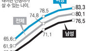 세계평균보다 11.8세 많아 101개국 중 22위日 82.7세 1위… 북한 67.3세로 75위 그쳐■ 유엔-통계청 ‘기대수명’ 자료 2010년에 태어나는 한국인은 평균 79.4세까지 살 수 있다는 분석 결과가 나왔다. 이는 세계 평균(67.6세)보다 11.8세 많은 것이며 통계가 확보돼 추정이 가능한 101개국 가운데 22위에 해당한다. 12일 유엔과 통계청에 따르면 내년 한국인의 기대수명은 2005년보다 1.9세 늘어난 79.4세로 분석됐다. 유엔은 2년마다 내놓는 세계인구전망 보고서를 통해 5년 단위로 각국의 기대수명을 발표하고 있다. 기대수명은 연령별 사망확률을 통해 해당 연도에 태어난 신생아가 평균 몇 살까지 살 수 있을지를 추정한 것이다. 한국인의 기대수명은 1985년 66.8세에서 1990년 69.8세, 1995년 72.7세, 2000년 74.4세, 2005년 77.5세 등으로 급속히 늘어나는 추세다. 한국은 최근 25년 동안 기대수명이 12.6세 늘었는데 이는 같은 기간 세계 평균 기대수명 증가분(5.9세)의 2배가 넘는 것이다. 한국 여성의 기대수명은 82.5세로 18위인 반면 남성은 75.9세로 29위에 그쳤다. 정부 관계자는 “고령화가 진전되면서 한국인의 기대수명이 빠르게 늘고 있다”며 “노동생산성 감소와 복지비용 증가 등의 문제가 심각한 만큼 고령인구 활용 대책 등을 마련하고 있다”고 말했다. 기대수명이 가장 높은 국가는 일본으로 82.7세이며 홍콩(82.2세), 아이슬란드 스위스(81.8세), 호주(81.5세), 프랑스 이탈리아(81.2세), 스페인 스웨덴(80.9세) 등이 뒤를 이었다. 한국은 영국과 공동으로 22위를 차지했다. 미국이 79.2세로 뒤를 이었다. 중국은 73세로 51위이며 북한은 67.3세로 75위에 그쳤다. 북한의 기대수명은 이라크(67.4세)와 몽골(66.4세) 사이로 1965년만 해도 56.7세로 남한(55.2세)보다 높았다. 하지만 1990년대 중반 역전돼 2010년에는 남북한 기대수명 격차가 12.1세에 이를 정도로 차이가 커졌다. 최하위권은 대부분 아프리카 국가들이 차지했다. 성별로 보면 여성의 2010년 기대수명은 일본(86.2세), 홍콩(85.1세), 프랑스(84.7세) 순으로 높았으며 남성은 아이슬란드(80.2세)에 이어 홍콩(79.4세), 스위스(79.3세), 호주(79.1세)가 뒤를 이었다.장원재 기자 peacechaos@donga.com}