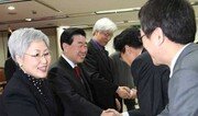 25일 서울 종로구 세종로 방송통신위원회에서 열린 ‘1기 상임위원 이임식’에서 이경자 부위원장과 송도균, 형태근 상임위원(왼쪽부터)이 직원들과 악수를 하고 있다. 2기 상임위원은 최시중 위원장을 비롯해 양문석 상임위원, 신용섭 전 방통위 방송통신융합정책실장, 홍성규 중앙대 신문방송학부 석좌교수, 김충식 전 동아일보 논설위원으로 구성됐다. 홍진환 기자 jean@donga.com}