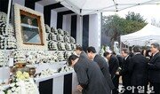 동아일보와 고려대, 중앙중고교를 세우고 제2대 부통령을 지낸 인촌 김성수(仁村 金性洙) 선생의 60주기 추모식이 16일 오전 경기 남양주시 화도읍 금남리 고인의 유택 앞에서 거행됐다. 추모식에는 김재호 동아일보·채널A 사장 겸 고려중앙학원 이사장을 비롯한 유족과 이명박 전 대통령, 이용훈 인촌기념회 이사장, 김학준 동북아역사재단 이사장, 김병철 고려대 총장 등 각계 인사 200여 명이 참석했다. 전두환 전 대통령과 양승태 대법원장은 추모 화환을 보내왔다. 인촌의 기일은 18일이지만 당일이 공휴일이어서 앞당겨 열렸다. 이날 행사는 추모 묵념에 이어 고인 약력 보고, 추모사, 소강연, 고인의 육성 청취, 광복 70주년 심포지엄 ‘선진사회로 가는 대한민국의 과제’ 자료집 봉헌, 헌화와 분향의 순서로 빗속에서도 경건하게 치러졌다. 앞서 인촌기념회와 동아일보, 채널A, 고려대는 올 1, 2월 공공성 등 4개 분야에 걸쳐 광복 70주년 심포지엄을 열었다. 이 자료집은 고인의 증손인 김재호 이사장이 봉헌했다. 이 전 대통령은 방명록에 ‘크게 기립니다’라고 적은 뒤 “인촌은 시대를 이끌었던 대단한 분이셨다”고 추모했다. 어윤대 전 고려대 총장은 “한국이 선진국이 됐다고 하지만 인촌 선생과 같은 큰 인물, 존경받는 큰 어른이 없다”며 “선생이 돌아가신 지 60년이 지났지만 선생의 존재가 더욱 무겁게 다가온다”고 말했다. 이용훈 이사장은 추모사에서 “인촌 선생은 일제의 학정과 해방 후 혼란의 소용돌이 속에서 조국의 광복과 건국을 위해 온갖 고난과 역경을 겪으면서도 힘든 역할을 해냈다”며 “인촌 선생의 좌우명이었던 공선사후(公先私後)와 신의일관(信義一貫)의 정신은 돌아가신 지 60년이 된 지금도 우리의 사표가 되고 있다”고 강조했다. 인촌 서거 당시 갓 스무 살로 고려대에 입학한 홍일식 전 고려대 총장은 “인촌 선생은 얼마든지 세속적 안락을 누릴 수 있음에도 불구하고 스스로 험난한 구국의 길을 택했다”고 추모했다. 언론사 연구 권위자인 정진석 한국외국어대 명예교수는 소강연을 통해 인촌 선생이 언론과 교육, 기업 등 다방면의 왕성한 활동을 통해 독립국이라면 정부가 수행했어야 할 공적 역할을 대신 감당한 점을 높이 평가했다. 정 명예교수는 “민족기업 경성방직주식회사를 육성해 식민지 치하 조선의 경제발전에도 힘을 쏟았다”고 설명했다. 일제강점기 해외 항일투쟁에 비해 소홀한 평가를 받고 있는 국내 교육·문화운동에 대한 재평가가 필요하다는 지적도 있었다. 정 교수는 “동아일보와 보성전문은 민족진영 인사들의 활동무대이자 은신할 수 있는 둥지였다”고 덧붙였다.남양주=김상운 sukim@donga.com·조종엽 기자}