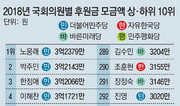 지난해 국회의원 후원금 모금은 ‘더불어민주당 쏠림 현상’이 두드러졌다. 자유한국당 의원들의 1인당 평균 모금액은 민주평화당, 정의당보다 적었다. 26일 중앙선거관리위원회에 따르면 지난해 국회의원 298명의 1인당 평균 모금액은 1억6607만여 원이었다. 개인별로 살펴보면 민주당 노웅래 의원이 3억2379만여 원을 모금해 1위를 기록했다. 민주당(129명)이 총모금액과 1인당 평균 모금액에서 각각 259억3735만여 원과 2억106만여 원을 기록해 가장 많았다. 한국당(112명)은 총 156억715만여 원을 모금했다. 한국당의 1인당 평균 모금액은 1억3934만여 원으로 민주평화당(14명)의 2억241만여 원, 정의당(5명)의 1억7874만여 원보다 적었다. 바른미래당(29명)은 1인당 평균 1억850만여 원을 모금했다. 중앙당 후원회 후원금의 경우 정의당이 16억9431여만 원을 모금해 2년 연속 1위를 차지했고 민주당은 2억7040만여 원을 모금했다. 한국당은 중앙당 후원회가 없다. 모금액 상위 10명 중 8명이 민주당 소속 의원으로 나타났다. 한국당은 주호영 의원(3억1406만여 원·5위)만이 10위권에 들었다. 반면 하위 10명 명단에는 한국당 의원 6명이 포함됐다. 하위 1∼5위가 모두 한국당 소속이었다. 친박(친박근혜)계로 분류돼는 홍문종(3365만 원), 유기준(6665만 원), 김재원 의원(1억569만 원) 등은 한국당 의원 평균에도 못 미쳤다. 최하위는 구속 기소돼 재판이 진행 중인 한국당 이우현 의원(1290만 원)이었다. 각 당 지도부의 경우 민주당 이해찬 대표는 3억1721만여 원을 모금해 2017년 100위권 밖에서 4위로 뛰어올랐다. 평화당 정동영 대표(3억987만여 원), 바른미래당 김관영 원내대표(3억73만여 원) 등도 3억 원 넘게 모금했다. 비례대표인 정의당 이정미 대표도 1억5846만여 원을 모금해 비례대표 한도액(1억5000만 원)을 넘어섰다. 한도액을 넘은 초과분은 다음 해로 이월돼 모금 한도가 그만큼 줄어든다. 국회의원들끼리 후원금 ‘품앗이’를 하는 관행은 여전했다. 민주당에서는 정청래 전 의원이 손혜원 의원에게, 이철희 의원이 기동민 의원에게 각각 500만 원을 후원했다. 한국당에서는 이군현 전 의원이 권성동 의원에게, 정두언 전 의원이 김용태 의원에게 각각 500만 원을 후원했다. 민주당 이해찬 대표와 우상호 의원, 한국당 박명재 박순자 정유섭 의원 등이 지방자치단체장 또는 지방의원들에게 500만 원을 후원받았다.박성진 psjin@donga.com·강성휘 기자}