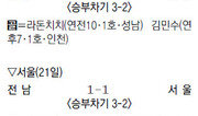 퇴장 당해 스탠드에서 경기를 지켜보던 신태용 성남 일화 감독은 연장 종료 휘슬이 울리기 직전 무전기로 벤치에 있는 김도훈 코치에게 뭔가 지시를 내렸다. 김 코치는 미드필더 김정우를 빼고 골키퍼 김용대를 투입했고 그동안 골문을 지켰던 정성룡을 필드 플레이어로 돌렸다. 승부차기를 감안한 포석. ‘스탠드 용병술’은 기막히게 적중했다. 22일 성남종합운동장에서 열린 정규시즌 4위 성남과 5위 인천 유나이티드의 K리그 6강 플레이오프. 성남은 연장까지 1-1로 경기를 마친 뒤 승부차기에서 김용대의 선방에 힘입어 3-2로 이겨 준플레이오프에 올랐다. 성남은 21일 FC 서울을 역시 승부차기 끝에 3-2로 따돌린 전남 드래곤즈와 25일 안방에서 플레이오프 진출을 다툰다. 김용대의 선방이 돋보였다. 성남 첫 키커 라돈치치가 크로스바를 넘기는 어이없는 실축을 했지만 김용대는 인천 첫 키커 유병수의 볼을 막아냈다. 이어 정성룡의 실축 등으로 이어진 2-2 상황에서 김용대는 인천의 네 번째 키커 정혁의 킥을 가슴에 안았다. 김용대는 5번 키커로도 나서 상대 골키퍼 송유걸을 가볍게 속여 3-2를 만들었다. 이런 김용대의 활약에 주눅이 든 것일까. 인천 챠디는 너무 힘을 줘 공을 차는 바람에 크로스바를 훌쩍 넘겼다. 이날 신 감독은 승부차기를 예견이라도 한 듯 정성룡의 등번호 1번이 새겨진 필드 유니폼을 오전에 준비한 것으로 밝혀져 신들린 용병술이라는 평가를 받았다. 신 감독은 “8일 수원 삼성과의 FA컵 결승전 승부차기에서 김성환과 전광진이 실패해 오늘 승부차기에서 둘을 빼는 것을 고민했다. 그러다 보니 정성룡을 필드 플레이어로 바꿨고 김용대를 투입할 수밖에 없었다”고 말했다. 성남은 전반 인저리 타임 때 수비수 샤샤와 신 감독, 그리고 연장 후반 수비수 조병국이 퇴장당하는 등 9명이 싸우는 수적 열세 속에서도 끝까지 선전했고 결국 신 감독의 절묘한 용병술로 귀중한 승리를 챙겼다. 6위 전남은 21일 역시 연장 120분 혈투를 1-1로 마친 뒤 승부차기에서 3위 서울을 3-2로 따돌렸다. 서울은 승부차기에서 이상협과 이종민이 실축하고 기성용의 슛이 전남 골키퍼 염동균의 선방에 걸리며 눈물을 흘렸다. 박항서 전남 감독은 “2007년 포항 스틸러스가 K리그 5위로 6강 플레이오프에 올라 강호들을 무너뜨리고 정상까지 올랐듯 최선을 다해 끝까지 가겠다”고 말했다.양종구 기자 yjongk@donga.com}