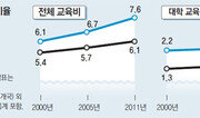 우리 국민이 부담하는 학교 교육비(공교육비) 비율이 경제협력개발기구(OECD) 회원국 평균의 3배 이상인 것으로 나타났다. 9일 OECD가 회원국 34개국을 대상으로 조사한 결과에 따르면 한국은 국내총생산(GDP)에서 민간이 부담하는 공교육비가 차지하는 비율이 2.8%로 OECD 평균(0.9%)의 3배를 넘는 수준인 것으로 나타났다. 민간부담률 2.8%는 OECD 1위다. 반면 정부가 교육비로 부담하는 비율은 GDP 대비 4.9%로 OECD 평균(5.3%)보다 낮았다. 정부가 부담하는 교육비 비율이 낮다 보니 민간이 부담하는 비율이 다른 국가들에 비해 늘어난 것이다. 민간 부담 교육비란 전체 공교육비에서 정부 지원금을 뺀 수치로 가계(입학금, 수업료 등)와 사학재단(재단전입금) 등이 부담하는 교육비를 뜻한다. 과외, 학원 등 사교육비는 공교육비에 포함되지 않는다. 민간 부담금과 정부 지원금을 모두 합친 전체 학교 교육비는 GDP 대비 7.6%로 전체 평균(6.1%)보다 1.5%포인트 높았다. 특히 고등교육(대학, 대학원)으로 갈수록 민간의 부담은 더 커지는 것으로 나타났다. 민간이 부담하는 고등교육비의 GDP 대비 비율은 1.9%로 OECD 평균(0.5%)의 4배 가까운 수준이었고, 정부 부담 비율은 0.7%로 평균보다 0.4%포인트 낮았다. 또 한국은 고등교육비의 27.0%를 정부가 부담했지만 OECD 회원국은 평균 69.2%를 정부가 부담하는 것으로 조사됐다. 이처럼 교육비에 대한 민간 부담은 높았지만 교육 여건은 여전히 주요 선진국보다 떨어지는 것으로 나타났다. 한국의 교사 1인당 학생 수는 △초등학교 18.4명 △중학교 18.1명 △고등학교 15.4명으로 전체 평균보다 각각 3.1명, 4.6명, 1.6명 많았다.임현석 기자 lhs@donga.com}