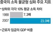 중국에서도 국민의 정치 참여의식이 높아지면서 ‘부(富)의 분배’에 대한 관심이 고조되고 있으나 갈수록 빈부 격차가 커지고 있어 올해 양회(兩會·전국인민대표대회와 중국인민정치협상회의 전국위원회)에서도 가장 큰 화두가 될 것으로 보인다. 구삼학사(九三學社)는 3일 개막한 전국정협에 제출한 보고서에서 “소득 상위 10%와 하위 10%의 평균소득 격차가 1988년 7.3배에서 2007년 23.0배로 확대됐다”고 밝혔다. 구삼학사는 형식상 복수정당제인 중국에서 전국정협에 참여하고 있는 8개 민주당파 야당 중 하나이지만 사실상 공산당의 지시를 따른다. 구삼학사는 중국에서 부의 불균형은 크게 정부와 자본, 독과점 업종 등 세 방향으로 집중되고 있다고 주장했다. 정부 재정수입이 국내총생산(GDP)에서 차지하는 비중이 1994년 10.39%에서 2008년 19.99%로 높아졌으며 1996년에서 2007년 사이 근로자의 임금이 GDP에서 차지하는 비중은 53.4%에서 39.7%로 낮아졌다는 것. 또 업종별로는 전력 에너지 이동통신 등 소수 독점 기업이 장악한 독과점 분야의 근로자 평균임금이 전체 근로자 평균임금보다 10배가량 높았다고 이 보고서는 밝혔다. 도농 간 수입 격차도 2009년 3.33배에 이르는 등 매년 확대되는 추세다. 자칭린(賈慶林) 전국정협 주석은 3일 정협 개막 업무보고에서 “소득격차가 커지는 현상을 중시하고 있다”며 “이를 사회 안정에 영향을 주는 큰 요인으로 보고 소득분배 구조의 개선에 역점을 두어야 한다”고 강조했다. 원자바오(溫家寶) 총리도 지난달 27일 누리꾼과의 ‘인터넷 대화’에서 “파이(부)가 소수에 집중되는 것은 불공평하고 사회불안 요소가 되기 때문에 파이를 적절히 나누는 것이 정부의 의무”라고 강조했다. AFP통신 등 외신도 “지난해에는 8% 경제성장 등 내수 회복이 과제였으나 이제는 인플레이션 억제와 소득격차 확대에 따른 사회불안 해소가 올해 양회에서 주요 의제가 될 것”이라고 전했다. 한편 리자오싱(李肇星) 전국인대 대변인은 5일 개막에 앞서 4일 가진 기자회견에서 “중국의 올해 국방예산은 5321억1500만 위안(약 89조1665억 원)으로 전년 대비 7.5% 늘었다”고 밝혔다. 중국의 국방예산 증가폭이 한 자릿수인 것은 최근 10년 이래 처음이다. 리 대변인은 또 “올 전국인대에서는 경제발전 모델의 전환과 집값 안정 등 민생 방안, 도시 농촌 간 차별을 줄이는 선거법 개정 등이 논의될 것”이라고 밝혔다.베이징=구자룡 특파원 bonhong@donga.com}