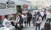 “뉴욕 한복판에 ‘밥차’가 떴다!” 정부가 18일(현지 시간)부터 한식 홍보를 위해 뉴욕 맨해튼에서 운영 중인 ‘모바일 키친(움직이는 주방)’이 현지에서 큰 인기를 끌고 있다. 한식을 맛보려는 뉴요커들의 줄이 200m 넘게 이어지는가 하면, 미국 유명 여배우도 깜짝 등장해 화제가 됐다. 농림수산식품부는 한식재단 및 뉴욕 내 한인 셰프, 한식당과 함께 이날부터 ‘한식 모바일 키친’ 운영을 시작했다. 다음 달 20일까지 매일 점심시간마다 500인분을 무료 제공하는 이 ‘밥차’는 뉴요커들에게 한식의 맛을 경험하게 하고 그 우수성을 홍보하는 게 목적이다. 뉴욕의 명소 18곳을 번갈아 돌며 김치볶음밥, 잡채, 해물순두부, 비빔밥, 갈비, 전, 고추장 삼겹살 버거 등을 선보일 예정이다. 행사 첫날 밥차가 선택한 곳은 뉴욕 맨해튼 브라이언트 공원. 이날 선보인 메뉴는 ‘불고기 오이김치 버거’였는데, 운영요원들은 이 퓨전 버거를 나눠주며 뉴요커들에게 김치의 제조 과정과 건강 효과를 알렸다. 버거를 맛본 마이크 수라비안 씨는 “뉴요커들은 입맛이 까다롭지만 김치는 매운맛이 독특하고 건강에도 좋다니 인기를 끌 것 같다”고 말했다. 이날 현장에는 미국의 인기 드라마 ‘가십걸’의 여주인공 엄마 역을 맡고 있는 유명 여배우 켈리 러더퍼드가 초청돼 분위기가 달아올랐다. 이날 행사에 참가한 뉴욕 단지(Danji) 레스토랑의 한인 셰프 후니 김 씨는 “한식을 선보일 기회가 생겨 기쁘다”며 “이번 캠페인을 통해 한식이 새로운 점심 트렌드로 자리 잡길 기대한다”고 말했다. 이번 행사에는 단지 외에도 금강산, 강서회관, 돈의보감, 삼수갑산 등 뉴욕의 한식당 9곳이 참여했다.임우선 기자 imsun@donga.com}