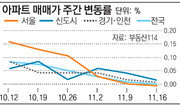 서울 아파트값이 2년 만에 떨어졌다. 19일 부동산 정보업체 부동산114에 따르면 지난주 서울 아파트값은 0.01% 하락했다. 부동산114가 집계하는 통계상으로 서울 주간 아파트값 상승률이 마이너스로 전환된 건 2017년 1월 초 이후 처음이다. 이번 정부 들어서는 처음 있는 일이다. 지난주 한국감정원이 서울 아파트값이 61주 만에 하락했다고 발표한 데 이어 부동산114 역시 같은 조사 결과를 발표하면서 서울 아파트값 하락세가 뚜렷해지고 있다는 분석이 나온다. 특히 재건축 시장 하락세가 두드러졌다. 지난주 서울 재건축 아파트값은 0.08% 떨어졌다. 지역별로는 재건축 단지가 많은 송파(―0.07%), 강동(―0.07%), 강남(―0.02%), 서초구(―0.01%)가 많이 떨어졌다. 서울 아파트 시장이 하락세로 접어들면서 신도시와 경기·인천 아파트값도 0.01% 오르는데 그쳤다. 가격이 더 떨어질 것이라 기대하는 수요자들이 많아지면서 관망세로 돌아섰기 때문이다. 강성휘 기자 yolo@donga.com}