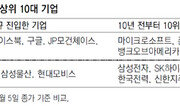 국내 시가총액 100대 기업 중 40% 이상이 최근 10년 새 교체됐지만 제조 및 금융 중심의 전통적 대기업들이 다수를 차지하는 구조에는 변화가 없었던 것으로 나타났다. 반면 같은 기간 미국은 첨단 정보기술(IT) 및 서비스 기업들이 시총 상위 기업으로 대거 약진하며 판도 변화를 이끌어 냈다. 17일 기업평가사이트 CEO스코어에 따르면 2006년 3월 말과 올해 9월 5일 종가 기준으로 한국과 미국 증시의 시총 상위 100대 기업을 비교한 결과 각각 41곳과 43곳이 교체된 것으로 나타났다. 교체율은 비슷했지만 신규 진입한 기업의 면모는 크게 달랐다. 미국은 시총 4위에 오른 페이스북을 비롯해 액센추어(44위), 차터커뮤니케이션스(45위), 엔비디아(46위), 프라이스라인닷컴(50위), 넷플릭스(63위), 페이팔(65위) 등 11곳이 신규 진입했다. 반면 같은 기간 이베이, 타임워너, 바이어컴 등 서비스 업체들과 HP, 모토로라 등 제조업체들은 100위권 밖으로 밀려났다. 특히 자동차 업종에선 테슬라가 83위로 새로 진입하면서 미국 내 매출 1위인 GM(88위)을 앞질렀다. 유통 업종에서도 아마존이 신규 진입해 3위에 오르는 등 업종 내 격변이 속출했다. 반면 한국은 4차 산업혁명과 관련된 서비스·IT 기업이 100곳 중 6곳에 불과했다. SK C&C와 합병한 SK(14위)를 비롯해 넷마블게임즈(28위), 삼성SDS(30위), 카카오(36위), CJ E&M(89위) 등 서비스 기업 5곳과 전자부품 업체인 LG이노텍(66위)이 시총 100대 기업에 신규 진입한 게 전부였다. 시총 상위 10대 기업들로 범위를 좁혀 보면 양국 간 격차가 더 두드러진다. 미국은 최근 10년 새 1위 애플을 비롯해 아마존, 페이스북, 구글, JP모건체이스, 웰스파고 등 6개 업체가 상위 10위에 신규 진입했다. 금융사인 JP모건과 웰스파고를 제외하면 모두 4차 산업혁명과 직결된 글로벌 IT·서비스 공룡들이다. 반면 한국은 같은 기간 시총 ‘톱10’에 새로 들어온 기업이 LG화학, 네이버, 삼성물산, 현대모비스 4곳으로, 네이버를 제외하면 모두 석유화학·건설·자동차부품 등 전통 제조업체들이다. 나머지 6곳도 삼성전자, SK하이닉스 외에 현대차, 포스코, 한국전력, 신한지주 등 제조업 및 금융업체들로 구성돼 있다.김지현 기자 jhk85@donga.com}