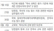한국사를 대학수학능력시험 필수과목으로 채택할지에 대한 결정이 연기됐다. 새누리당과 교육부는 12일 당정협의를 갖고 역사교육 강화방안을 논의했으나 핵심인 한국사 수능 필수에 대한 결론은 내리지 못했다. 당정은 12일 한국사 수능 필수를 확정할 예정이었다. 당정은 한국사를 대학 입시에 연계한다는 점은 원칙으로 하되 구체적으로 어떤 방식을 택할지는 여론을 더 수렴해 21일 대입 전형 간소화 방안과 함께 발표하기로 했다. 당정은 지난주 협의 때 한국사 수능 필수에 적극적이었으나 교육계의 반대 여론에 한발 물러선 것으로 보인다. 당정은 교원을 대상으로 하는 역사교육을 우선 강화하기로 했다. 내년 9월 신규교원 임용 시험부터는 한국사능력검정시험 3급 이상 자격자로 기준을 제한한다. 교감 자격 연수 대상자를 선정할 때도 이 시험 3급 이상 또는 일정 시간 이상의 연수를 받도록 할 예정이다. 교대와 사범대 교육과정에서도 한국사 교육을 강화한다. 일반 대학은 한국사를 교양필수로 지정하거나 한국사능력시험을 비롯한 인증 시스템을 갖추도록 독려할 예정이다. 교육부가 앞서 예고한 대로 내년부터 고교의 한국사 이수단위는 현행 5단위에서 6단위로 늘려 사실상 집중이수제 대상에서 제외한다. 교육부는 나승일 차관 직속으로 역사교육강화추진단을 만들고 국사편찬위원회에 역사교육지원단을 만들기로 했다.신진우 기자 niceshin@donga.com}
