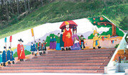 충북 영동에 5월 문을 연 국내 첫 ‘국악체험촌’의 야외공연장 벽면에 세종대왕 어가(御駕) 행차를 그린 벽화가 관광객들의 눈길을 사로잡고 있다. 22일 영동군 국악사업소에 따르면 군(郡)은 국악체험촌을 찾는 관광객들에게 볼거리를 제공하고, 콘크리트로 된 옹벽의 경관을 밝게 하기 위해 세종대왕 어가 행차 그림을 최근 그려 넣었다. 국악체험촌 내 우리소리관 앞 야외공연장에 있는 이 벽화는 면적 248m², 길이 58.6m, 높이 4.23m로 아크릴 페인트로 그려졌다. 벽화에는 국악체험촌이 들어선 영동군 심천면이 고향인 우리나라 3대 악성(樂聖) 중 한 명인 난계 박연 선생(1378∼1458)과 그의 음악 업적 달성을 지지해 준 세종대왕의 어가 행차 모습이 아기자기한 만화 캐릭터로 담겼다. 관광객 이수정 씨(32·여·서울 관악구)는 “국악체험촌과 어울리는 아주 인상적인 벽화”라며 “이 벽화를 배경으로 사진을 찍어 좋은 추억거리 하나를 만들고 간다”고 말했다. 심천면 고당리 난계사당 옆에 있는 국악체험촌은 7만5956m²의 터에 지하 1층, 지상 2층 규모의 건물 3채로 지어졌다. 300석 규모의 공연장과 세미나실 2곳, 국내 유일의 군립(郡立) 국악단인 난계국악단 연습실 ‘우리소리관’, 최대 300명을 수용할 수 있는 공연장, 50∼300명을 수용하는 체험실 5곳, 전문가 연습 공간인 ‘소리창조관’ 등이 들어섰다. 또 국악 체험객 200명이 한꺼번에 묵을 수 있는 숙박 공간인 ‘국악누리관’, 2011년 기네스북에 세계 최대 북으로 등재된 ‘천고(天鼓)’가 있는 ‘천고각’ 등도 있다. 국비, 도비, 군비 등 212억 원을 들인 이 체험관은 영동군의 관광 자원인 과일과 와인, 국악인을 연계한 체류형 국악타운을 통해 지역 경제에 활력을 불어넣기 위해 지어졌다. 김기열 국악사업소장은“국악체험촌을 찾는 관광객들의 추억에 남는 볼거리를 개발하도록 노력하겠다”고 말했다. 영동군은 난계 박연 선생의 음악 업적을 기리기 위해 다음 달 15∼18일 국내 최대 국악잔치인 ‘제48회 난계국악축제’와 ‘제6회 대한민국 와인축제’를 개최한다. 난계국악축제는 지난해와 올해 문화체육관광부가 뽑은 ‘대표적 공연예술축제’로 선정됐다.장기우 기자 straw825@donga.com}