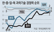 중국이 한국을 제치는 중점기술 분야가 많아지는 등 두 나라 간 기술 격차가 빠르게 줄어드는 것으로 분석됐다. 현대경제연구원은 11일 발표한 ‘한-중-일-독 과학기술 경쟁력 비교와 시사점’ 보고서에서 “과학기술 경쟁력의 절대적 지표(중간활동지표, 성과지표 등) 모두 한국이 4개국 중 가장 처진다”고 밝혔다. 개선 속도도 중국보다 느린 것으로 나타났다. 중간활동지표인 특허협력조약(PCT) 출원 건수는 한국이 2012년 약 1만2000건으로 일본의 25%, 중국과 독일의 60% 수준이었다. 1995∼2012년 특허협력조약 출원 건수의 연평균 증가 속도는 27.3%로 중국(35.8%)보다 낮았다. 특히 85개 중점과학기술 분야 중 한국이 중국보다 뒤처지는 건 15.3%(13개 분야)에 이르렀다. 의료(한의약 효능 및 기전 규명기술), 바이오(생명시스템 분석기술), 항공·우주(우주발사체 개발기술) 등이다. 중국은 한중일 3국 중 전자정보통신 바이오 등 7대 중점과학기술 분야에서 가장 빠르게 기술 격차를 줄이기도 했다. 최고 기술보유국과의 기술 격차 축소 연수는 중국이 평균 2.7년, 한국 1.3년이었다. 중국의 과학 경쟁력 성장세는 가파르다. 1997년 28위에서 지난해 7위로 올랐고, 같은 기간 기술 경쟁력은 45위에서 20위로 상승했다. 우리나라의 과학 경쟁력은 지난해 세계 6위로 1997년(20위)보다 14계단 올랐다. 기술 경쟁력은 28위에서 8위로 상승했다.최예나 기자 yena@donga.com}