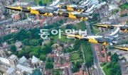공군 특수비행팀 블랙이글스가 25일 영국 노스요크셔 주 요크 민스터 대성당 상공을 비행하고 있다. 블랙이글스는 리아트, 판버러 에어쇼 등 해외 에어쇼 참가를 앞두고 영국에서 사전 비행 연습을 했다. 공군 제공}