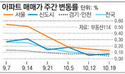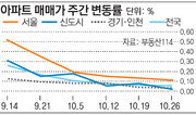서울 아파트값 상승세가 7주 연속 둔화됐다. 29일 부동산114에 따르면 지난주 서울 아파트값(26일 기준)은 0.11% 올랐다. 전주 상승폭(0.13%)보다 0.02%포인트 줄며 8월 마지막주(0.57%) 이후 꾸준히 상승폭이 감소했다. 지역별로는 영등포구(―0.04%)가 서울 자치구 중 유일하게 아파트값이 하락했다. 송파(0.00%), 금천(0.02%), 광진구(0.03%) 등에서도 집값이 안정된 모습이었다. 지난주 신도시 아파트값 상승률도 0.02%로 전주(0.08%)의 4분의 1수준으로 떨어졌다. 신도시 아파트 시장 상승세를 이끌었던 분당(0.00%) 아파트값이 제자리걸음 하는 등 시장 열기가 가라앉는 추세다. 경기·인천 아파트값은 0.04% 오르며 2주 연속 동일한 상승률을 보였다. 가을 이사철에도 전세시장은 전국적으로 안정세를 이어가고 있다. 서울 전세금은 지난주 0.01% 오르는데 그쳤으며 신도시와 경기·인천 전세금은 변동 없었다.강성휘 기자 yolo@donga.com}