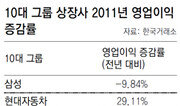 지난해 10대 그룹 가운데 영업이익이 가장 크게 증가한 곳은 SK그룹이었다. 영업이익이 늘어난 곳은 10대 그룹 중 4곳에 불과했고 한진그룹은 유럽 재정위기의 충격으로 최악의 성적표를 기록했다. 12일 한국거래소가 분석한 10대 그룹 상장사의 지난해 실적(K-IFRS 연결기준)을 살펴보면 SK그룹은 전년도보다 영업이익이 36.0% 급증해 10대 그룹 중 영업이익 증가율 1위를 기록했다. SK그룹의 지난해 영업이익은 14조4824억 원. 그룹 내 SK케미칼의 영업이익이 2309억 원으로 전년 대비 256.07% 급증해 가장 많이 늘었다. 현대자동차그룹은 영업이익이 17조6017억 원으로 전년보다 29.11% 늘어난 것으로 나타났다. 현대차와 기아차의 영업이익이 각각 전년보다 36.44% 늘어난 8조75억 원과 41.57% 늘어난 3조5251억 원을 달성한 덕분이다. 롯데그룹(16.32%)과 GS그룹(11.83%)이 영업이익 증가율 3위와 4위를 차지했다. 하지만 한진(―98.50%), 한화(―42.84%), LG(―42.32%), 현대중공업(―20.72%), 삼성그룹(―9.84%), 포스코(―1.29%) 등 6개 그룹의 영업이익은 오히려 줄었다. 특히 한진그룹은 2010년도 2조8억 원에 달했던 영업이익이 지난해 300억 원에 그치는 등 유럽 재정위기의 직격탄을 맞았다. 영업이익이 무려 70분의 1 수준으로 쪼그라든 것. 유럽 선주들의 재정난이 이어지며 한진해운이 4926억 원의 영업손실로 적자 전환한 데다 대한항공의 영업이익이 62.76% 줄었고 한진의 영업이익도 22.87% 감소한 탓이다. 장윤정 기자 yunjung@donga.com}
