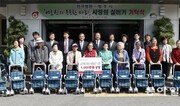 23일 한국병원이 충북 청주시청에서 실버카 74대(1000만 원 상당)를 기탁한 뒤 노인들과 기념촬영을 하고 있다. 청주시 제공}