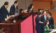 12일 국회에서 열린 자유한국당 나경원 원내대표(앞줄 오른쪽)의 교섭단체 대표 연설 중 더불어민주당 홍영표 원내대표(뒷줄 오른쪽에서 두 번째) 등이 본회의장 단상에 나와 항의하고 있다. 나 원내대표가 “더 이상 대한민국 대통령이 김정은 수석대변인이라는 낯 뜨거운 이야기를 듣지 않도록 해 달라”고 하자 홍 원내대표와 이철희 원내수석부대표(뒷줄 오른쪽) 등 민주당 지도부가 단상 앞으로 나와 항의했고, 한국당 정양석 원내수석부대표(뒷줄 오른쪽에서 세 번째) 등이 제지하고 있다. 여야의 실랑이를 중재하고 있는 문희상 국회의장(왼쪽).안철민 기자 acm08@donga.com}