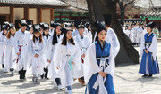24일 오후 서울 종로구 성균관대학교 명륜당에서 조선시대 의복을 입은 신입생들이 새학기를 맞아 조선시대 과거 합격 유생들을 위한 환영식을 재현한 '신방례' 행사를 하고 있다. 신방례는 조선시대 과거에 합격한 유생들을 위한 환영식이자 선배들이 신입 유생들을 대상으로 치렀던 일종의 통과의례이다.안철민 기자 acm08@donga.com}