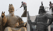 9일 오전 서울 광화문광장에서 세종대왕 동상(왼쪽 사진)과 이순신 장군 동상의 묵은 때를 벗겨내고 있다. 서울시는 매년 봄 두 동상을 세척해 부식을 방지하고 있다.안철민 기자 acm08@donga.com}