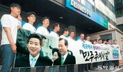 더불어민주당 이해찬 대표(가운데 마이크 잡은 사람)가 21일 서울 여의도 민주당 중앙당사 앞에서 ‘목포에서 봉하까지 민주주의의 길’ 출정식에서 인사말을 하고 있다. 이 행사는 서거 10주기를 맞은 김대중·노무현 전 대통령의 생가 등을 찾아 추모하는 일정으로 짜여 있다.안철민 기자 acm08@donga.com}