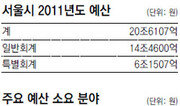 서울시가 내년 예산안에 초등학교 전면 무상급식을 위한 비용을 배정하지 않았다. 시는 10일 발표한 2011년도 예산안 20조6107억 원에 시교육청이 시와 자치구가 비용의 50%를 부담한다는 전제로 추진하겠다고 밝힌 시내 공립초교 전체 재학생 대상 무상급식 예산을 반영하지 않았다. 그 대신 시는 초중고교 급식비 지원 대상을 현재 소득 하위 11%에서 내년 16%로 확대하는 데 필요한 예산 278억 원을 책정했다. 이번 조치는 오세훈 시장의 “민선 5기 내 급식비 지원 대상을 가구 소득 하위 30% 선까지 늘리겠다”는 공약에 따른 것으로 시교육청이 추진하고 있는 전면 무상급식과는 취지가 다르다. 시 관계자는 “시교육청과 급식 지원 관련 협의를 계속하겠다”면서도 “협상이 결렬되면 전면 무상급식은 시교육청이 독자적으로 해야 할 것”이라고 말했다. 또 시는 오 시장 공약인 ‘3무(無) 학교’를 실현하기 위해 학습준비물비 지원에 52억 원, 학교보안관 지원에 144억 원, 방과후 학교 활성화에 83억 원, 원어민 영어보조교사 확대에 67억 원 등을 배정했다. 교육복지 분야 예산은 모두 1445억 원으로 올해보다 468억 원(47.9%) 증가했다. 이날 서울시가 발표한 내년도 예산은 올해(21조2573억 원)보다 6466억 원(3%) 줄어든 것이다. 시 예산이 감축된 것은 외환위기 당시인 1999년 이후 처음이다. 시는 내년 예산에서 행사, 축제성 경비를 올해보다 359억 원(43.8%), 홍보·간행물 예산을 89억 원(19.4%) 감축했다. 저소득층, 노인, 장애인, 여성, 청소년 등에 대한 사회복지 예산은 4조4296억 원을 편성해 올해보다 2493억 원(6%) 늘렸다. 시는 정부의 일자리지원 사업 축소를 고려해 일자리 예산에 1979억 원을 편성했다고 설명했다. 시의회가 반대하는 한강예술섬 건립, 서해뱃길 사업에는 각각 406억 원, 752억 원을 책정해 내년에 사업을 추진하기로 했다.조종엽 기자 jjj@donga.com}