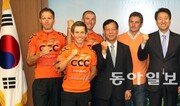 사상 최초로 비무장지대(DMZ)에서 평화의 레이스를 벌인 ‘2010 투르 드 DMZ∼서울 국제사이클대회’(동아일보사 서울시 강원도 경기도 육군 대한사이클연맹 공동주최) 단체 종합 우승팀인 ‘CCC 폴샛’(폴란드) 선수들과 감독 등 7명이 25일 동아일보 최맹호 대표이사 부사장과 함께 서울시청을 방문해 오세훈 서울시장과 환담했다. 오 시장은 “‘투르 드 프랑스’ 같은 대회가 한국에도 필요하다고 생각했는데 이번 대회가 그 출발점이 됐으면 한다”며 “의미 있는 대회에서 우승한 것을 축하한다”고 말했다. 피오트르 바데츠키 ‘CCC 폴샛’ 감독은 “힘든 코스였지만 대회를 즐겼고, 한국은 처음 와보는데 대회 코스 주변과 서울 모두 정말 아름답다”고 답했다.조종엽 기자 jjj@donga.com}