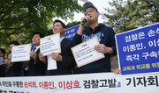 7일 오후 서울 서초구 서울중앙지검 앞에서 자유청년연합 회원들이 손석희 JTBC 앵커와 이상호 고발뉴스 기자, 이종인 알파잠수기술공사 대표를 검찰에 고발하기 전 기자회견을 하고 있다. 회원들은 이 3명이 다이빙벨의 성능을 과대 포장해 결국 정부의 구조작업을 방해했다며 공무집행 방해 및 사기죄로 고발한다고 밝혔다. 박영대 기자 sannae@donga.com}