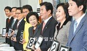 민주통합당 한명숙 대표(오른쪽에서 네 번째) 등 지도부가 20일 최고위원회의에서 총선 후보자 경선을 위한 국민선거인단 모집 전화번호인 ‘1688-2000’을 아이패드에 한 자씩 띄워 광고하고 있다. 전영한 기자 scoopjyh@donga.com}