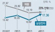 삼성전자의 지난해 4분기(10∼12월) 기대 이상의 실적을 내면서 애플과의 영업이익률 격차도 역대 최저치로 좁혀질 것이란 전망이 나왔다. 8일 삼성전자에 따르면 지난해 4분기 영업이익률은 17.36%였다. 지난해 2분기(4∼6월) 16.20%보다 1.16%포인트 높다. 최근 2년 사이 가장 높은 수치다. 애플의 영업이익률은 그동안 삼성전자가 넘볼 수 없는 수준이었다. 2015년 1분기(1∼3월) 애플(31.51%)과 삼성전자(12.69%) 간 영업이익률 격차는 18.82%포인트에 달했다. 그해 4분기에도 애플 영업이익률은 삼성의 2.76배였다. 이 격차는 지난해부터 점차 좁혀지기 시작했다. 지난해 2분기(4∼6월)에는 7.62%포인트로 한 자릿수가 됐다. 이때가 지금까지 중 가장 작은 차이였다. 지난해 4분기 삼성전자는 반도체 호황으로 깜짝 실적을 낸 반면 애플은 역성장을 경험했다. 애플이 20% 안팎의 영업이익을 기록할 경우 양 사의 영업이익률 차이는 역대 최저인 3%포인트 정도까지 줄어들 것으로 전망된다. 애플은 팀 쿡 최고경영자(CEO)를 비롯한 경영진 연봉을 처음으로 줄였다. 지난해 목표했던 실적을 달성하지 못한 데 따른 결정이다. 애플은 6일(현지 시간) ‘2016 회계연도’(2015년 10월∼2016년 9월) 매출이 2156억 달러(약 258조 원)로 목표보다 3.7% 낮았다고 공시했다. 평소 100% 성과보상금을 받던 애플 경영진은 올해 89.5%만 받는다. 쿡 CEO는 기본 연봉 300만 달러에 현금 보상금 537만 달러 등 총 875만 달러(약 105억 원)를 받아 전년보다 수령액이 15% 줄었다.김지현 기자 jhk85@donga.com}