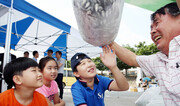 경북 청도군 청도천 둔치마당에서 어린이들이 방류할 치어를 살펴보고 있다. 청도군은 토종 어류인 쏘가리와 메기를 비롯해 8만여 마리를 방류했다. 12월까지 하천 생태계 보호 및 어족자원 육성 사업을 벌인다. 청도군 제공}