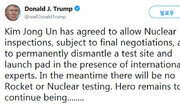 도널드 트럼프 미국 대통령이 19일 남북 평양공동선언이 발표된 직후 트위터에서 ‘북한이 핵 사찰(nuclear inspection)에 합의했다’고 밝히면서 김정은이 내놓은 비공개 메시지에 관심이 쏠리고 있다. 국제사회에서 통용돼 온 ‘핵 사찰’은 핵무기와 핵물질, 핵시설 등을 신고하면 국제원자력기구(IAEA) 전문가들이 현장을 방문해 직접 검증하는 과정을 뜻한다. 북한이 이런 의미의 핵 사찰에 합의했다면 트럼프가 종전선언의 대가로 김정은에게 요구해온 핵 신고서 제출에 어느 정도 합의한 것으로 볼 수 있다. 그러나 이 내용은 문재인 대통령과 김정은 국무위원장이 서명한 평양공동선언이나 기자회견에는 들어 있지 않다. 김정은이 비핵화와 관련해 공동선언에 합의한 내용은 △국제 전문가들의 참관하에 동창리 미사일발사장을 영구 폐기하고 △미국의 상응 조치에 따라 영변 핵시설의 영구적 폐기 같은 추가 조치를 취해 나간다는 두 가지가 전부다. 동창리 미사일발사장의 참관을 핵 사찰이라고 보기는 어렵다. 이 때문에 김정은이 문 대통령과의 정상회담 과정에서 비공개 메시지를 미국에 전달한 것 아니냐는 관측이 흘러나오고 있다. 제2차 북-미 정상회담에서 트럼프 대통령과 핵 사찰 문제를 본격적으로 논의할 수 있다는 의사를 중재자인 문 대통령을 통해 비밀리에 전달했다는 것. 트럼프 대통령이 트위터에서 핵 사찰을 언급하면서 ‘최종 협상에 부쳐질(subject to final negotiations)’ 핵 사찰이라고 설명을 달아 놓은 부분도 주목된다. ‘최종 협상’이 북-미 정상회담인지, 아니면 영변 핵시설의 폐기를 결정할 미국의 상응 조치 관련 협상인지는 확실치 않지만 공개하지 않은 모종의 의제가 있었다는 추측은 가능한 부분이다. 이와 관련해 정의용 청와대 국가안보실장은 브리핑에서 “영변 핵시설 폐기를 포함한 추가적인 조치들이 있을 것이라고 했기 때문에 북-미 협상을 지켜보면 구체적인 결과가 나올 것으로 기대한다”고 말했다. 이정은 기자 lightee@donga.com}