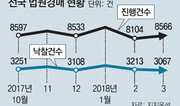부동산시장 선행 지표 중 하나인 경매시장에 찬바람이 불고 있다. 3일 법원 경매 정보업체 지지옥션에 따르면 지난달 전국에서 경매가 진행된 8566건 중에서 낙찰된 건수는 3067건으로 집계됐다. 낙찰률(전체 경매 건수 대비 낙찰 건수 비율)은 35.8%로 2014년 12월(34.1%) 이후 3년 3개월 만의 최저치다. 낙찰 건수는 관련 통계가 작성된 2001년 이후 가장 적다. 올해 들어 전체 경매 건수도 줄어드는 추세다. 2월 전국 경매 진행 건수는 8104건으로 역대 최저치였다. 지난달에는 이보다 400여 건 늘었지만 1월(9911건)에 비해 여전히 줄어든 상태다. 건당 응찰자 수는 지난해 8월 4명 아래로 떨어진 뒤 계속해서 3명대에 머무르고 있다. 서울 경매시장도 상황이 좋지 않다. 지난달 서울의 상가, 아파트 등의 법원 경매 낙찰가율은 83%로 2월(87.9%)보다 5%포인트 가까이 떨어졌다. 평균 응찰자 수도 건당 3.7명으로 1월(4.7명), 2월(4.5명)보다 적었다. 지난달 104건이 나온 서울 아파트(주상복합 포함) 경매에 참여한 평균 응찰자 역시 건당 6.6명으로 2월(8.3명)보다 줄었다. 낙찰률(59.6%)도 2월(71.9%)보다 떨어졌다. 다만 낙찰가율(감정가 대비 낙찰가)은 2월 100.4%에서 지난달 101.6%로 소폭 올랐다. 이창동 지지옥션 선임연구원은 “부동산 경기 전망이 불확실해지면서 당분간 경매 진행 건수와 응찰자가 모두 줄어드는 현상이 이어질 것”이라고 내다봤다. 고준석 신한은행 부동산투자자문센터장은 “감정가 산출 이후 실제 경매까지 6개월 시차가 있기 때문에 경매시장 전망은 좀 더 지켜봐야 한다”고 말했다.강성휘 기자 yolo@donga.com}
